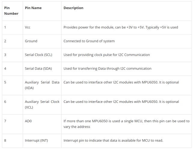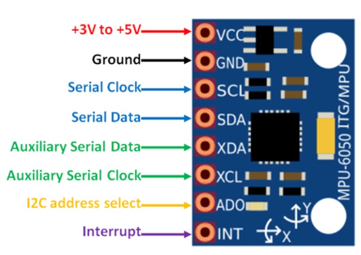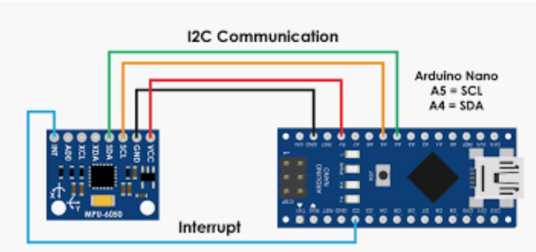 5v to 5v * Ground to Ground * Digital pin 2 (arduino interrupt) to MPU INT (IMU’s interrupt) pin. * Digital pin 4 (Arduino SDA) to MPU SDA pin These are the I2C communication lines * Digital pin 5 (Arduino SCL) to MPU SCL pin These are the I2C communication lines*