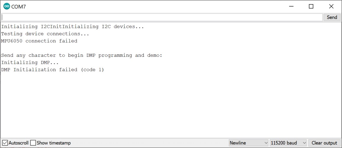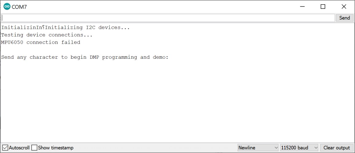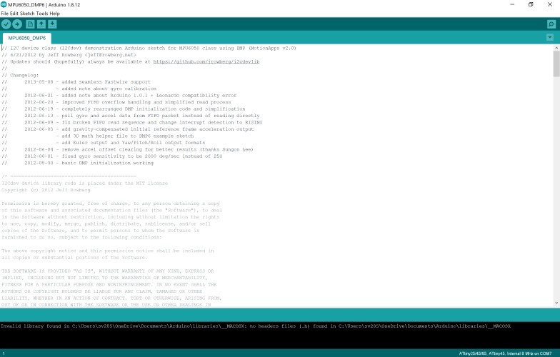 I then opened Arduino IDE. I went to File –> Examples –> MPU6050 (it’s at the very bottom of the side menu) –> Examples –> MPU6050_DMP6 and opened that sketch.