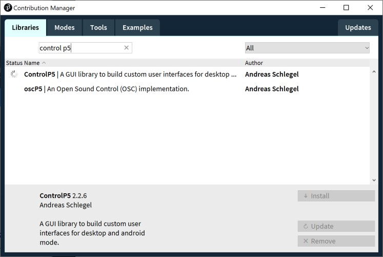 To import the control p5 library I went to Sketch -> Import Libraries -> Add Libraries then searched and Installed it. Serial was already installed.