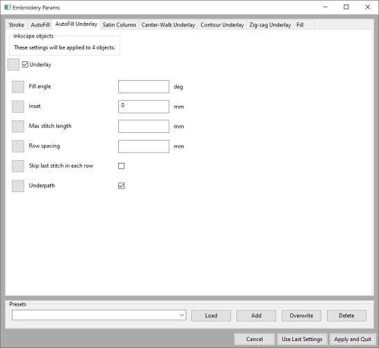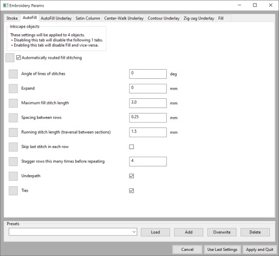 I then navigated to Extensions -> Ink/Stitch -> Params to parametrize my design. I needed a fill stitch. According to ink/stitch’s website, much of the work will be done automatically by algorithms. I need to enable auto-fill underlay and make sure a few things are enabled that are described in great detail on that side and this other ink/stitch auto-fill-param site.