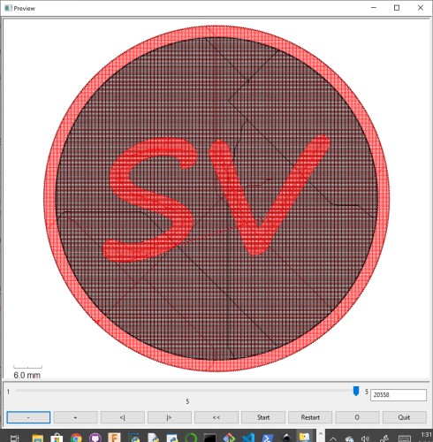 I then pressed the Edit End -> Lock button, then pressed the Up-arrow at the bottom left corner of the page to start the embroidery machine. When each color is finished being stitched, the machine beeps, and you have to press the green arrow again.