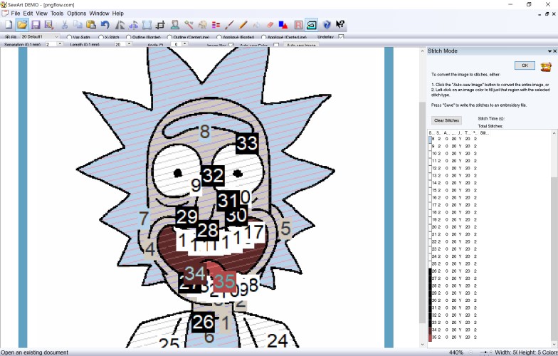 I then made all the stitches using the Stitch Image tool on the top menu Bar. I used the default fill outlay stitch. I want all sections to be the a simple, uniform stitch because I want all parts of the face to have similar textures.