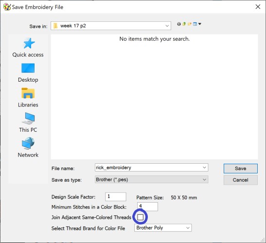Two prompts appeared asking me what filetype I wanted to save this as. It first prompted me to save the file as an image file, and then it prompted me to save the embroidery file. I saved it as a .pes (the accepted file format for Brother embroidery machines)