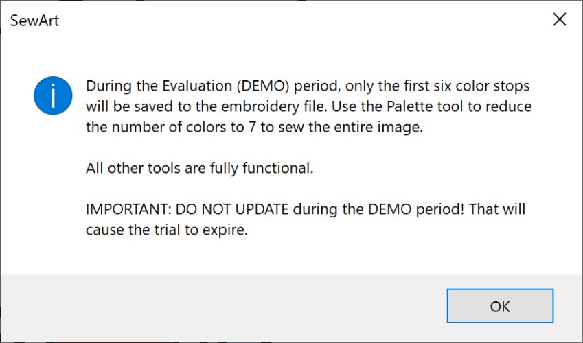 At first, I was a little confused.I knew that I could only have 6 colors total, because I was using the 30 day demo of Sew Art. I knew I had that, according to SewArt’s in program Color Merge tool. This led me to believe that Color Stops referred to each individual shape with a stitch assigned to it (In that case I have 37 color paths). However, I browsed the web for tutorials that specifically used the 30 day demo, and found many examples with more than 6 “color stops”.