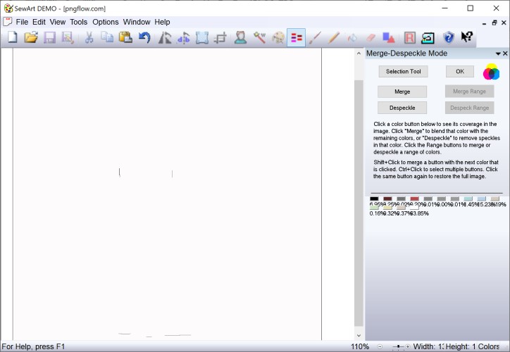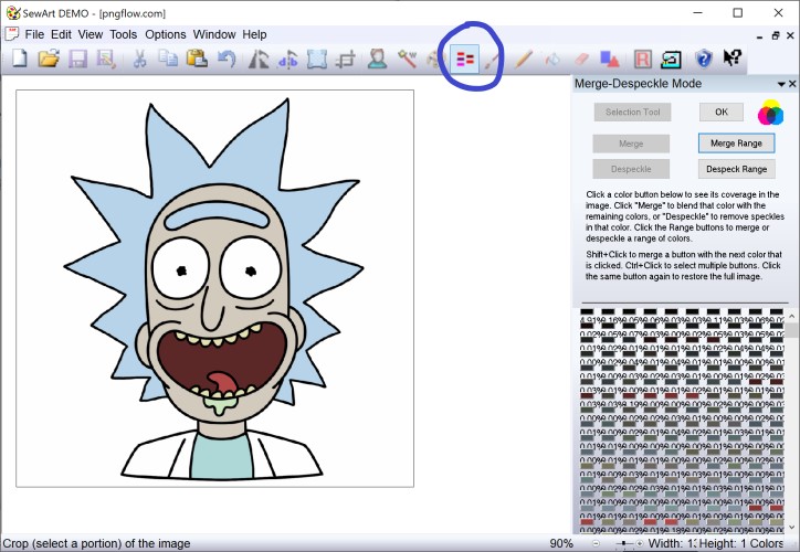 If you navigate to the Merge Colors menu on the top toolbar, you can see that the image contains many colors. Since I am using the SewArt Demo, which only allows you to use 6 colors, I needed to simplify the image.