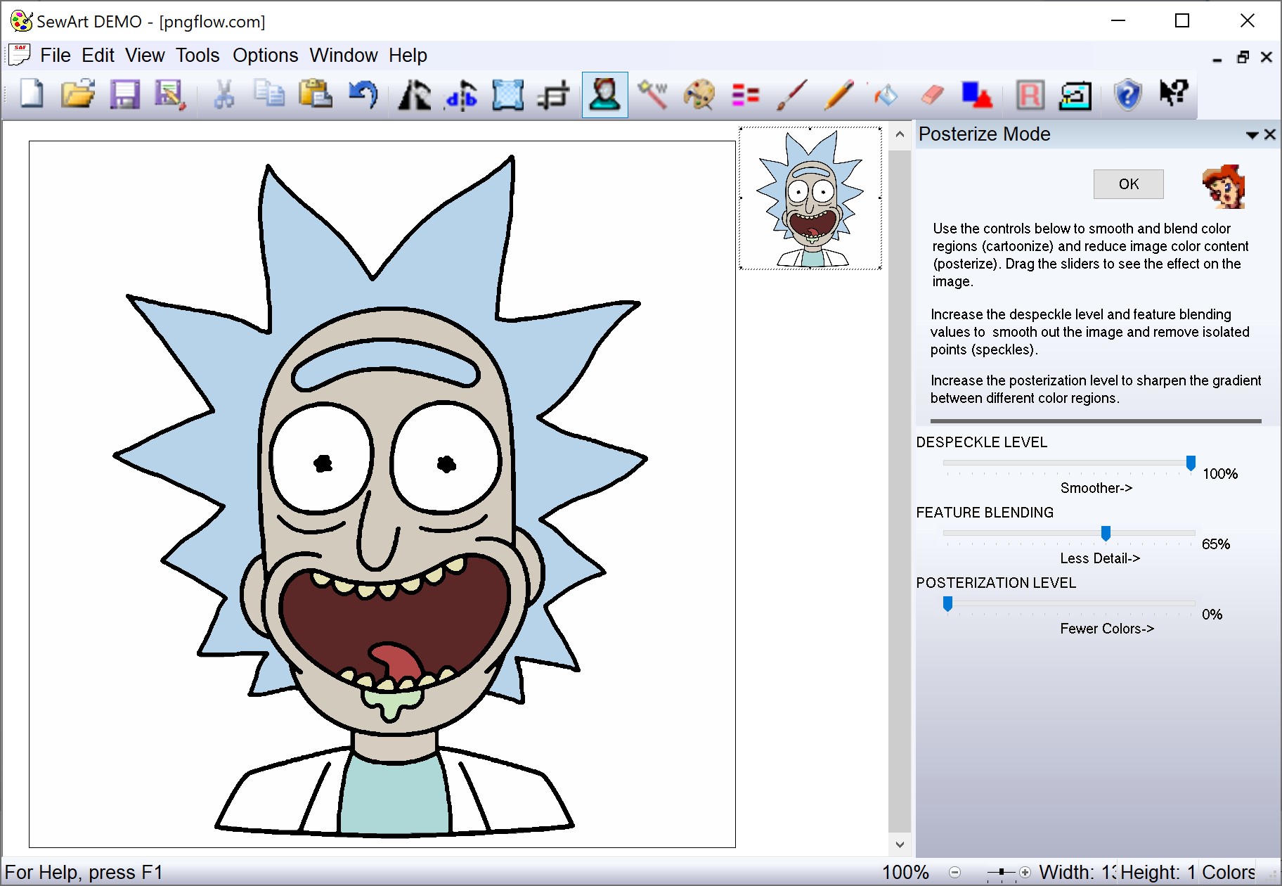 However I still had more than 6 colors. I navigated to the Merge Colors menu to view the colors I had remaining, and used the Merge Range Tool and chose to merge all colors with an “image percentage convergence” under 15%. This is a very low value, the recommended value is 50%. However, I found that any higher values made Rick’s tongue merge with the rest of the mouth/ some other color.