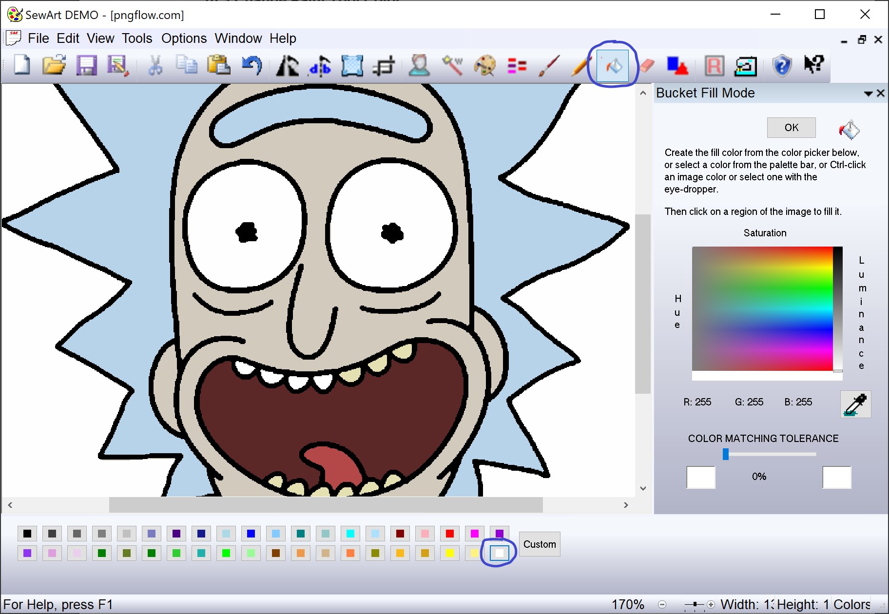I tried to merge the teeth with white, but it turned out the original yellowish color of the teeth kept converging to the same color as Rick’s skin. I used the Paint Bucket tool, selected the color white from the pre-prepared palette at the bottom, and clicked on every tooth to change it’s color. I still had to get rid of a few colors, so I used this same tool to paint out the green stain dribbling down Rick’s mouth.
