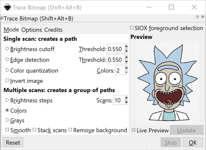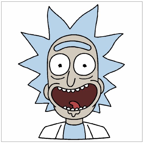 I cleaned up the image by deleting a lot of the extra colors. I am ok with just having a couple of main colors, without all the additional border colors. One thing that made it a bit more difficult was the fact that all the layers are separated by colors. One of the brown-ish colors that I wanted to delete around the borders/behind the eyes was on the same layer as Rick’s mouth. So, I tried using the Edit paths by nodes tool, selected the layer I wanted to be on, highlighted all the nodes I wanted to delete, and deleted them all.
