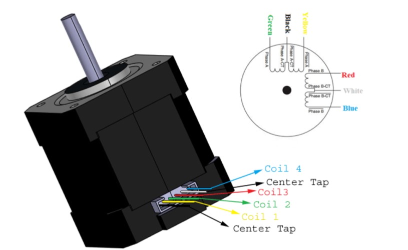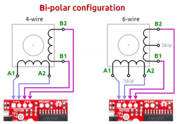 Using these diagrams, we were able to figure out which coils were which on unipolar vs bipolar motors. As long as the wires line up (coils 1, 2, 3, 4 or coils 4, 3, 2, 1) when they are plugged into the shield, the motor will function. If the motor spins in the wrong direction, simply flip the order of the pins.