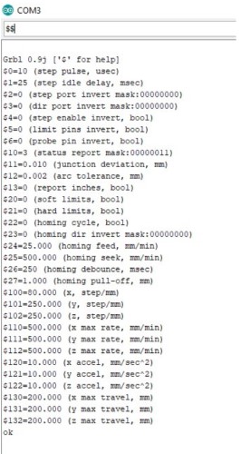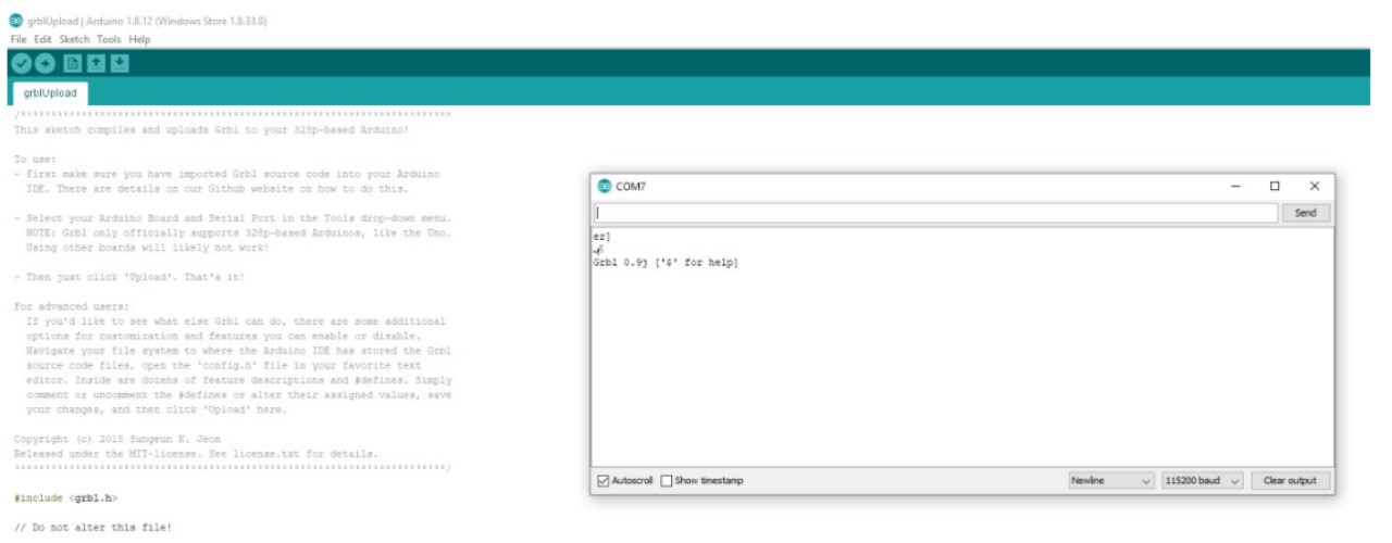 Once you do this, you can open the Serial Monitor to start communicating with GRBL. One you set the Baud rate to 115200, the last line on the serial monitor below will appear: