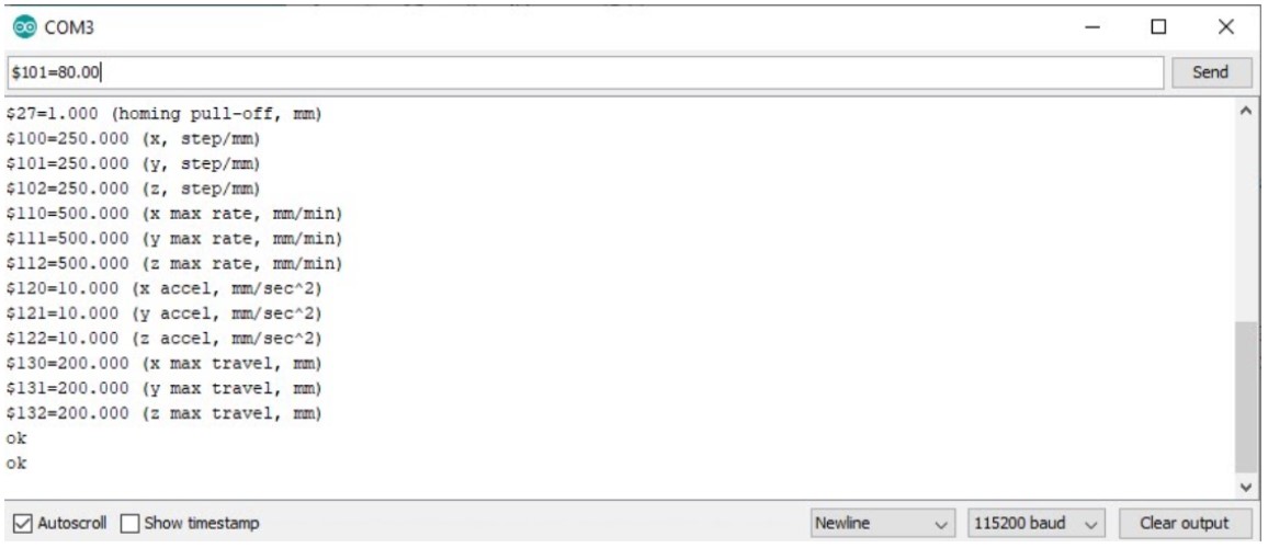 Nema Motors have 80 steps per 1 mm. The Nema motors were controlling the X and Y axis. To change the default steps/mm in GRBL for the X axis, you type “$100=80.00”. To change it for the Y axis, you type “$101=80.00.”