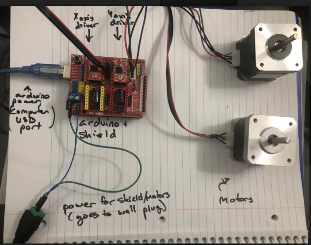 To control the motors with G-code, we decided to use GRBL. This program is a free, open source, high performance software for controlling the motion of machines that move, that make things, or that make things move, and will run on a straight Arduino. The language it reads is G-code, which is the list of instructions often used for automated machines (i.e. CNC machines, milling machines, 3d printers…) to instruct the machines on what tools to move/how to move them, in order to make something.