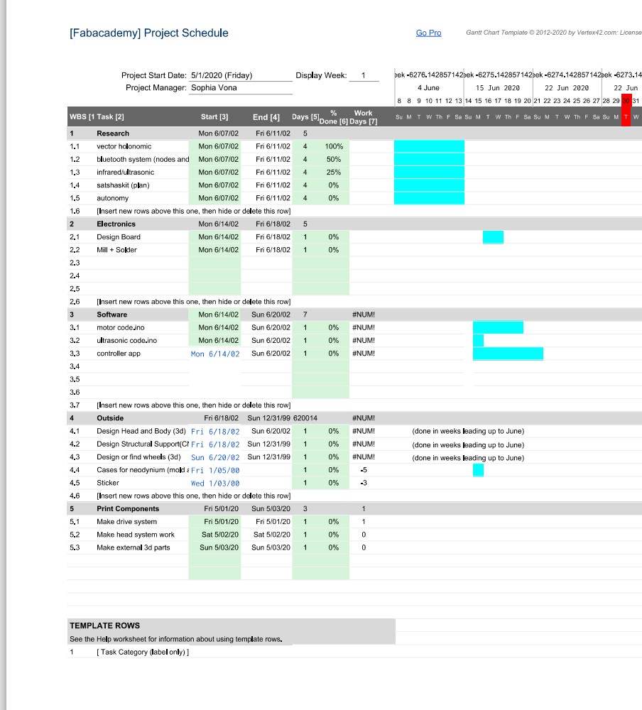 I decided to make a Gannt chart to organize the rest of my project. I made a complete list of every part of the project that I need and put it into an excel spreadsheet template that should help me keep track of how far I am along in the process. It describes what needs to be done, and what will happen when as of the 21st of June.