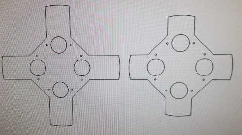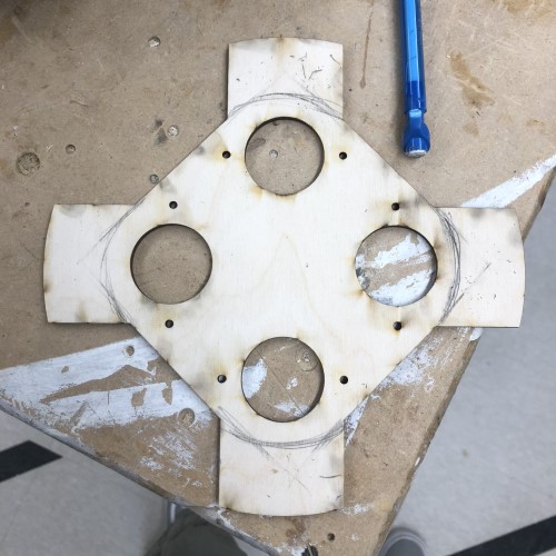 The main structure (in the middle) would be CNC’d from .373 inch wood. It has a small “compartment” jutting out the bottom where I will place batteries. This will also help add a bit of weight. I want the center of gravity to be low, that will help it balance.