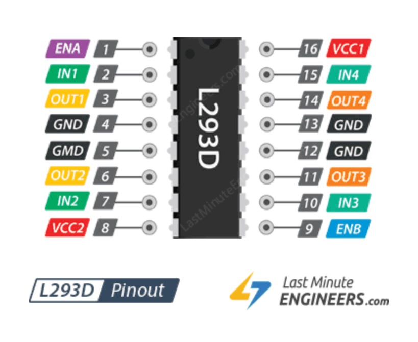 The data relayed to the input pins from the microcontroller are relayed to the outputs pins,a d this controls the direction and speed of the motor. For example: If the satshakit wrote a “high” to input pin 1, then output pin 1 would send power to the motor, and the motor will spin in one direction. If the satshakit wrote “high” to input pin 2, the output pin 2 would send power to the other wire of the motors, and it would spin in the opposite direction. Note: 1 motor must be attatched to in and out 1/2, and the other must be attatched to in and out 3/4. You shouldn’t attatch one motor to 1 and 3, and another to 2 and 4, because the way it controls the direction is through an H-bridge inside the L293d chip, and for it to work they must be in the appropriate pairs.