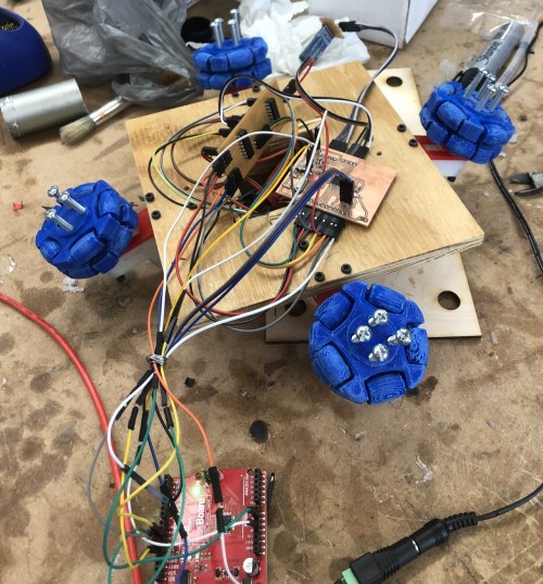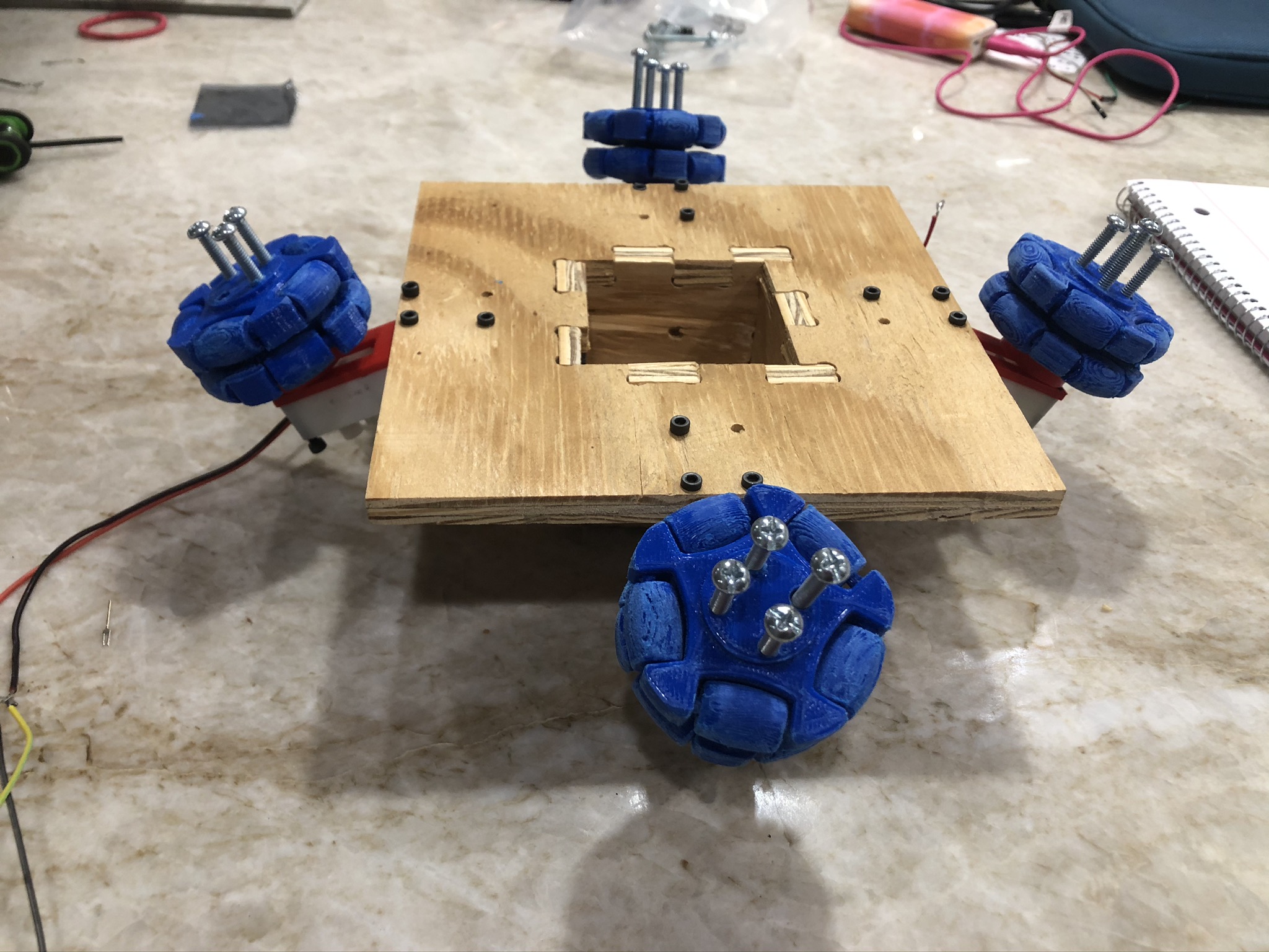 For my final project I wanted to try to make a derivative version of the loveable Star Wars bb8 droid. The droid I will try to make will have a holonomic drivetrain that sits inside a spherical “shell,” and the drivetrain will push the sphere around to make it move (like a hamster running around in a hamster wheel). The head will be magnetically attached, and the motors will be controlled by a processing app on my PC via a bluetooth module.