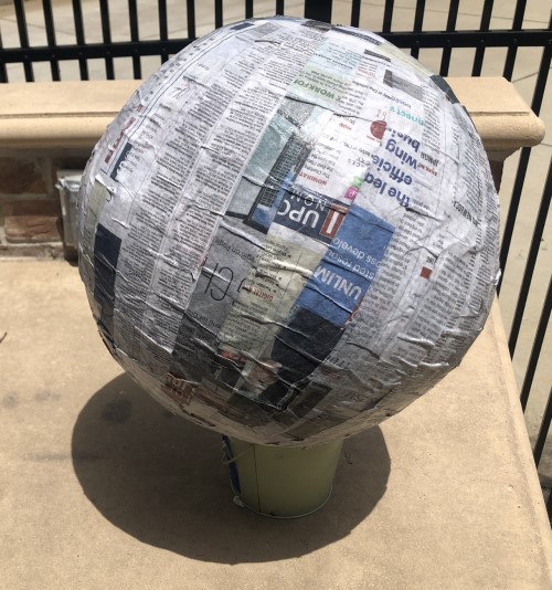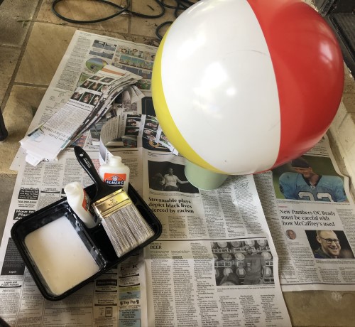 - Cover a 2 inch stip of the beach ball in the glue/water mixture with the paintbrush. Lay a strip of newspaper over ball flat. Repeat right next to the first strip. Keep going until you have 1 layer of newspaper strips parallel to each other covering the ball. I originally tried to soak the newspaper strips in the glue mixture as one would do with flour/water paper mache, but it gets really heavy/ falls off the ball. It gets messy fast. Leave it outside to dry completely.