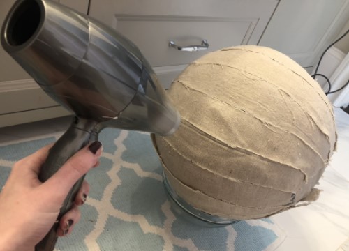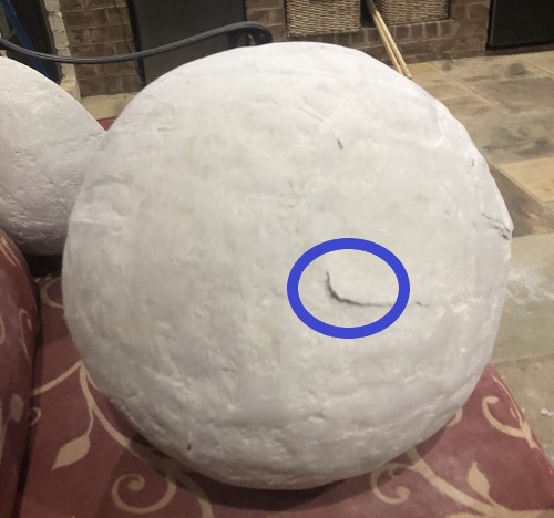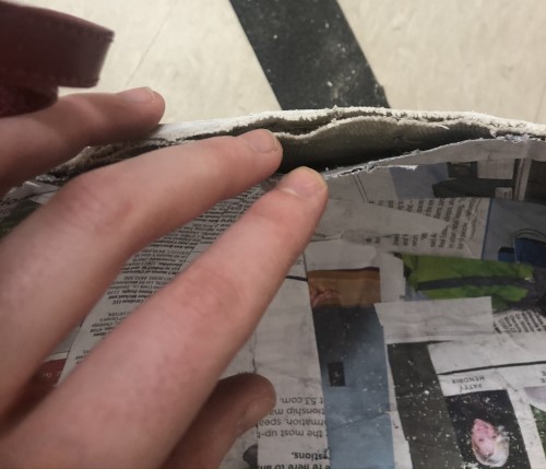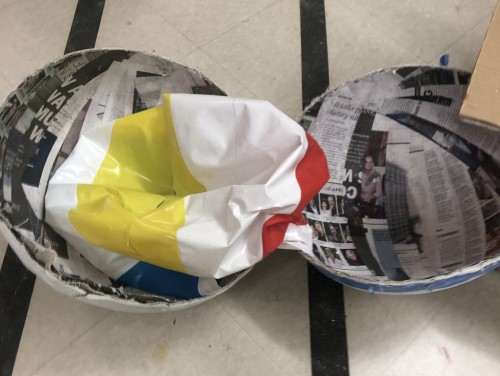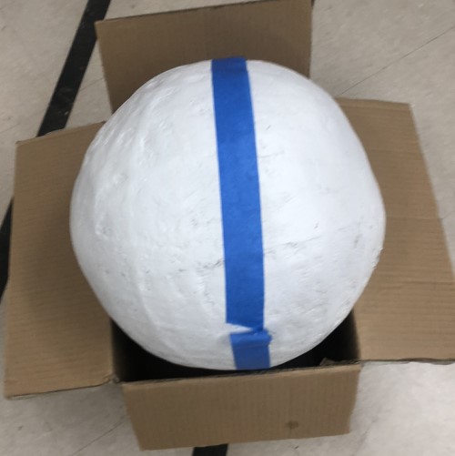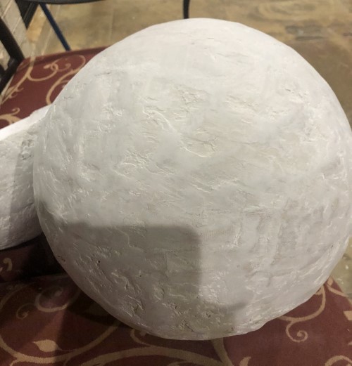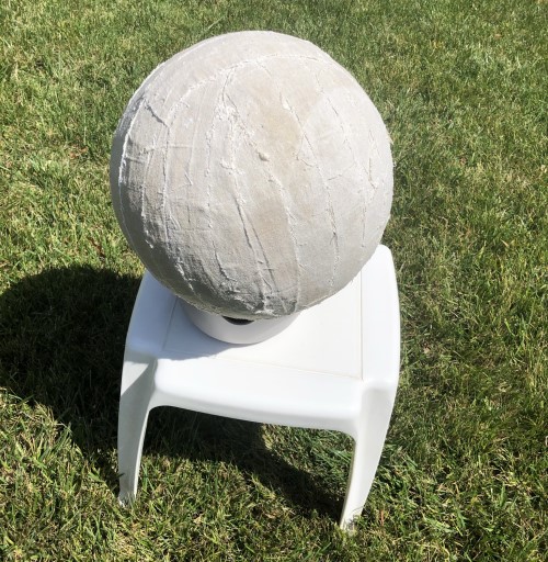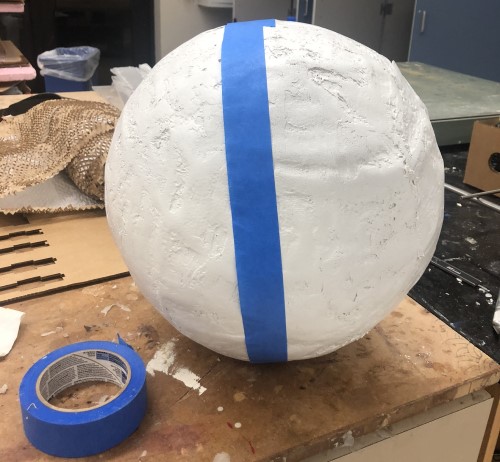 I’m a little wary of how stable this ball is going to be. In the instructables it was a very hard shell. My version is a lot flimsier, even after I added the bondo. Also, the edges almost look like they’re coming apart. I ended up using more hot glue to press them together so they do not fall apart, but they cleasry did not adhere to each other.
