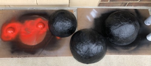 I then spray painted the outside black (the back of the plastidip said spray paint could be used over it, and it would still work). BB8 is technically white and orange, but I figured that since this robot would be rolling around on the floor of the fablab/outside on the ground, it would pick up a lot of dirt and start to look filthy quickly. The balck spray piant will disguise that better than the white spray paint.