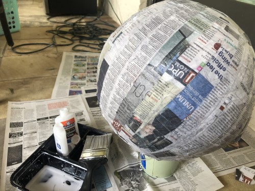 The general idea was to use a beach ball and cover it with multiple layers of paper mache/ canvass mache to create a strong shell. Also- instead of using flour and water, you use PVA glue (aka elmers) and water because it is stronger and will crack less.