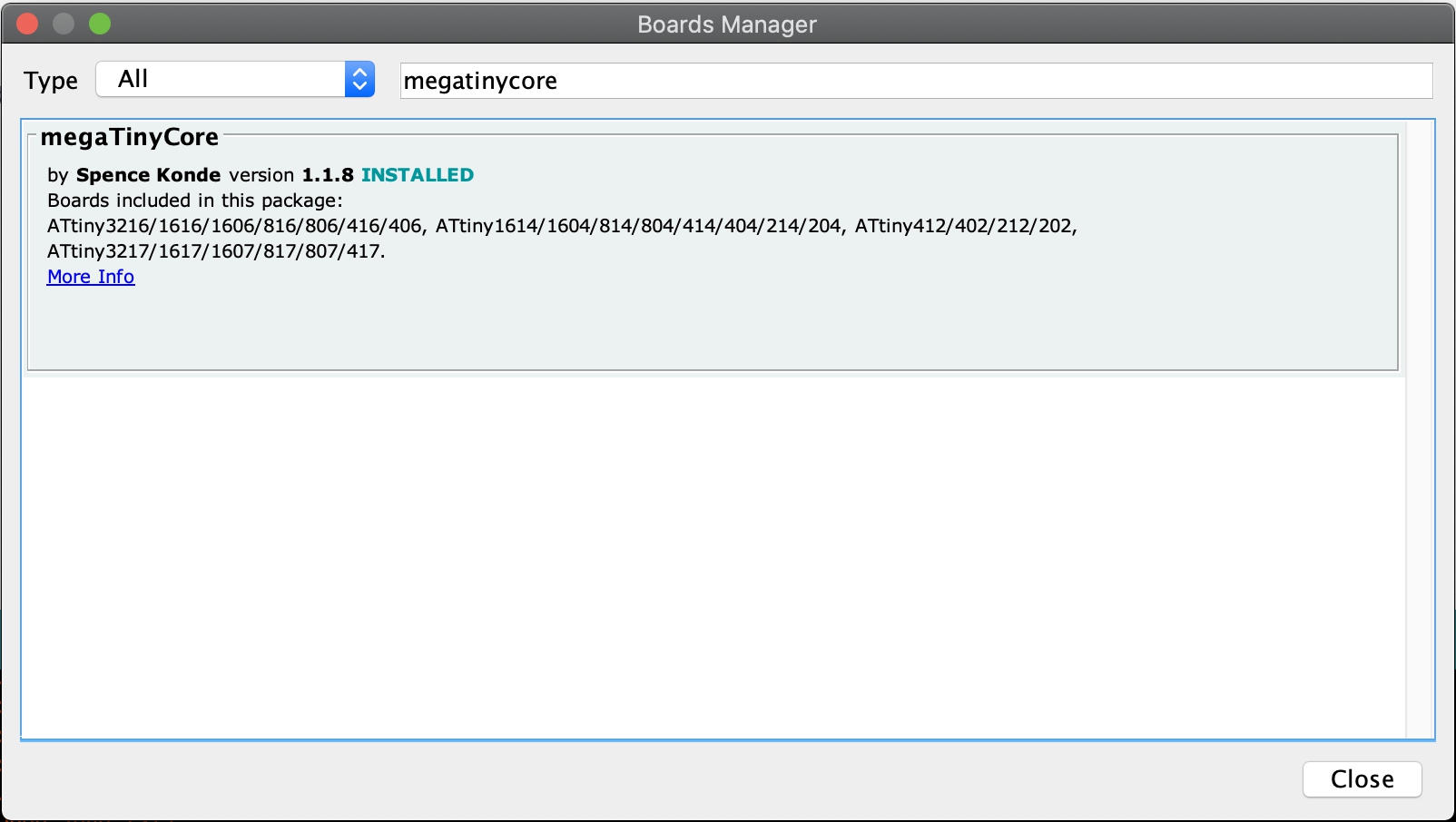 Next, in the board manager, I installed “MegaTinyCore” and “Mega AVR Boards”.