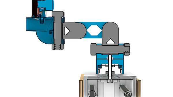 The original design, is a time-lapse rail with a timing belt as a dolly that moves along an axis, and the camera is attached to an articulated monopod; this raw model was developed in SOLIDWORKS®, as a simple short rail, translated from STEP to Rhino and IGES files, for compatibility.