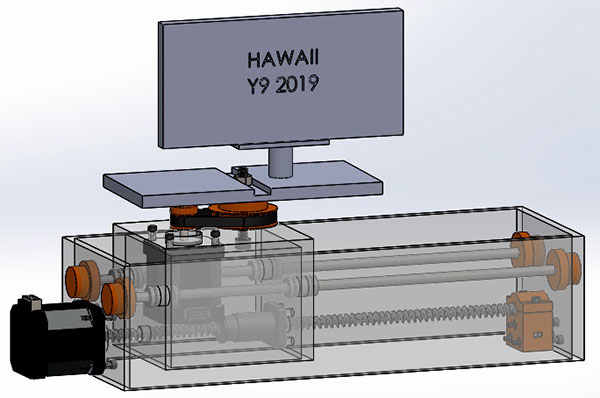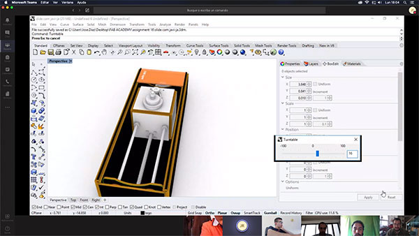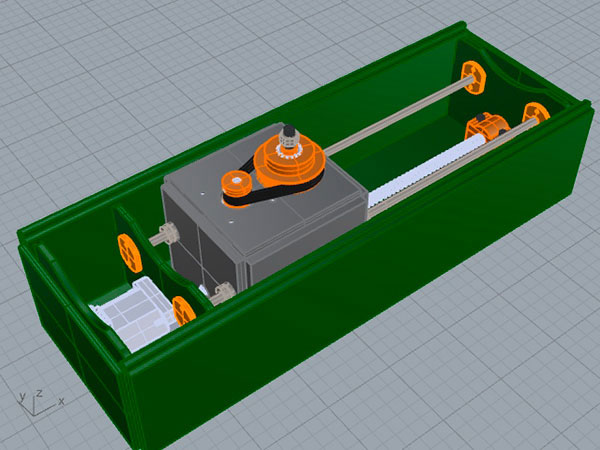 Finally, the model evolved to a more static piece, using the main axis, setting in the beginning of the box all electronics.