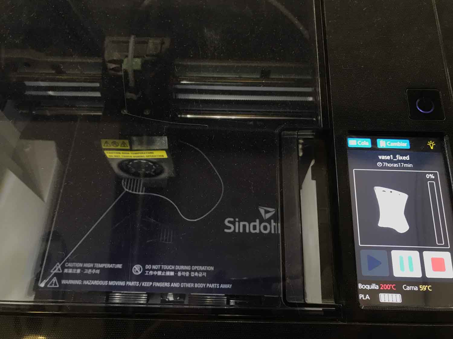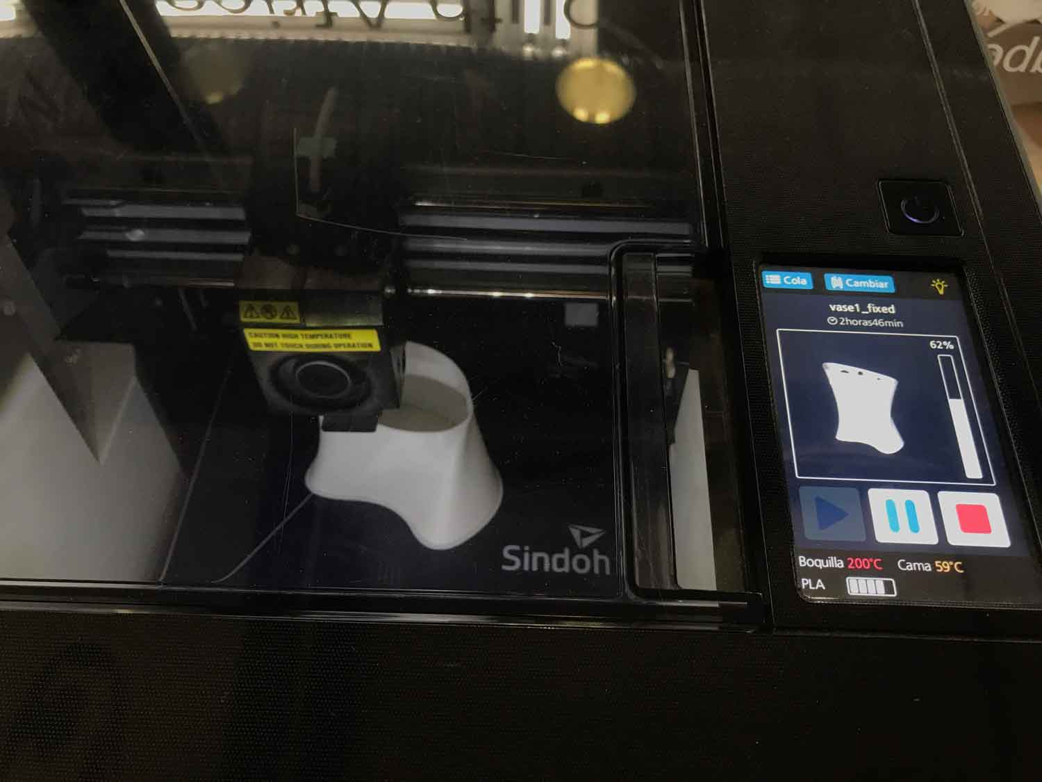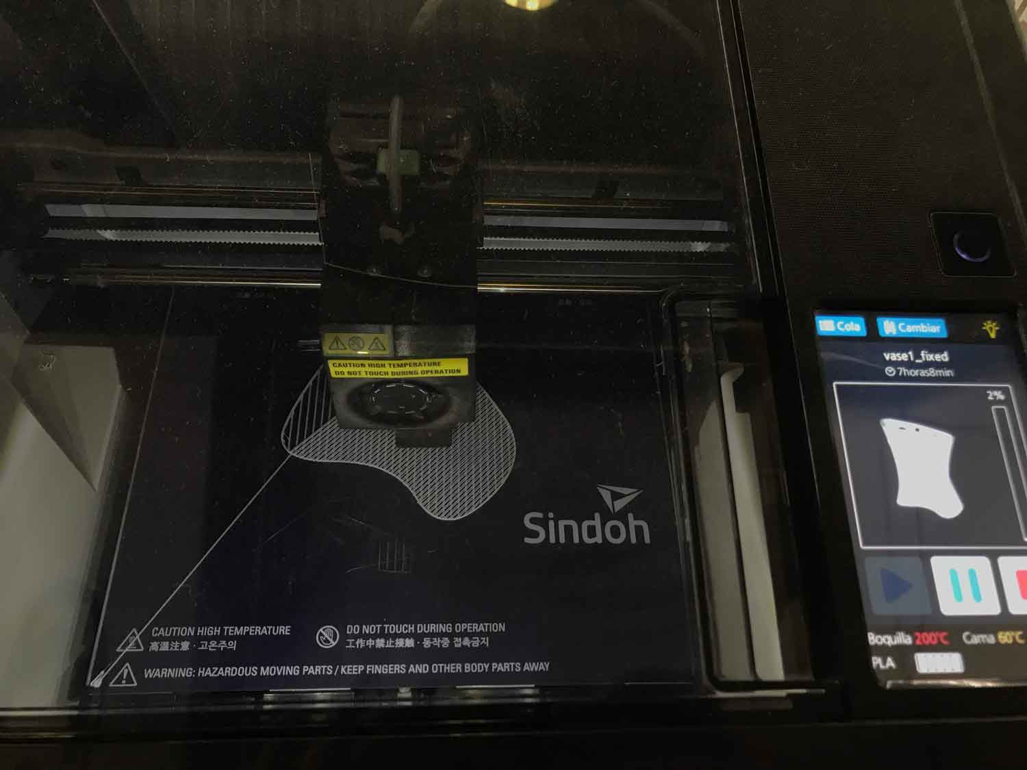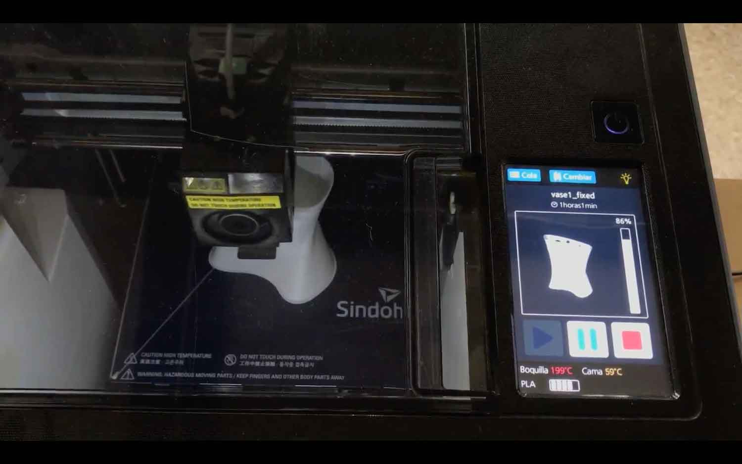 Using Vectorworks I draw an organic 2D irregular form, then I duplicate it and put them in defferent position in the Z axys, Then I convert those irregular forms into NURBS in order to made a LOFT model using the LOFT command to create a 3D solid. After that, with the SHELL command with a 2 mm wall thickness I convert my solid into a 3D Vase object then I substract some cilinders to make some holes in my model, then I export it into a .STL file,  I uploaded the file to NETFABB to get a new verify file to print in 3D. Before start printing my Vase, I opened the file in 3DWOX to set the parameters of printing, of the "supports" , to verify the GCode and to saw the time that the SINDOH 3D printer will spend printing. Here the link to design files:
