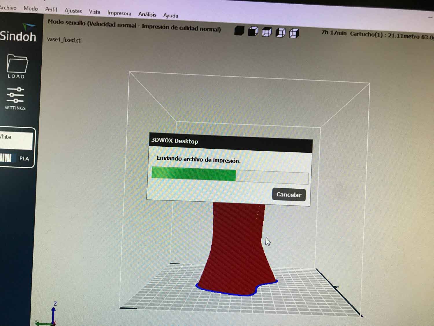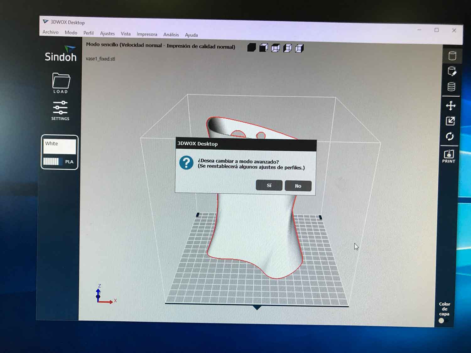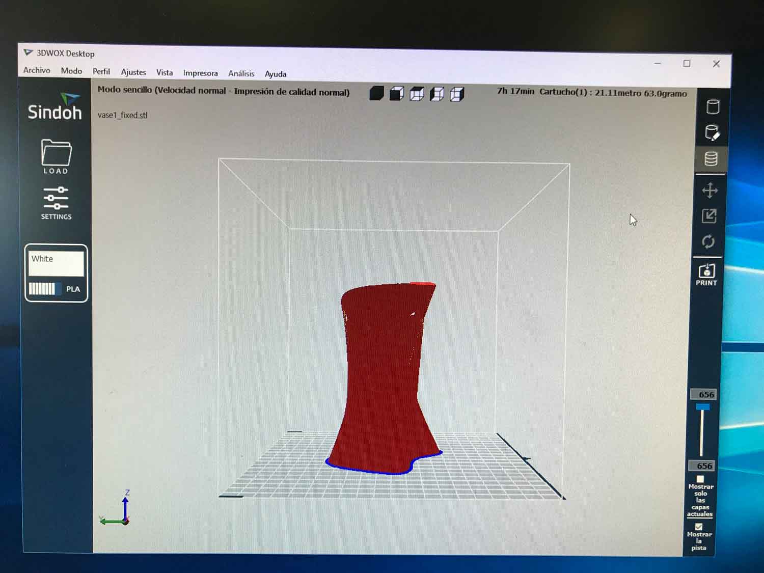 Using Vectorworks I draw an organic 2D irregular form, then I duplicate it and put them in defferent position in the Z axys, Then I convert those irregular forms into NURBS in order to made a LOFT model using the LOFT command to create a 3D solid. After that, with the SHELL command with a 2 mm wall thickness I convert my solid into a 3D Vase object then I substract some cilinders to make some holes in my model, then I export it into a .STL file,  I uploaded the file to NETFABB to get a new verify file to print in 3D. Before start printing my Vase, I opened the file in 3DWOX to set the parameters of printing, of the "supports" , to verify the GCode and to saw the time that the SINDOH 3D printer will spend printing. Here the link to design files: