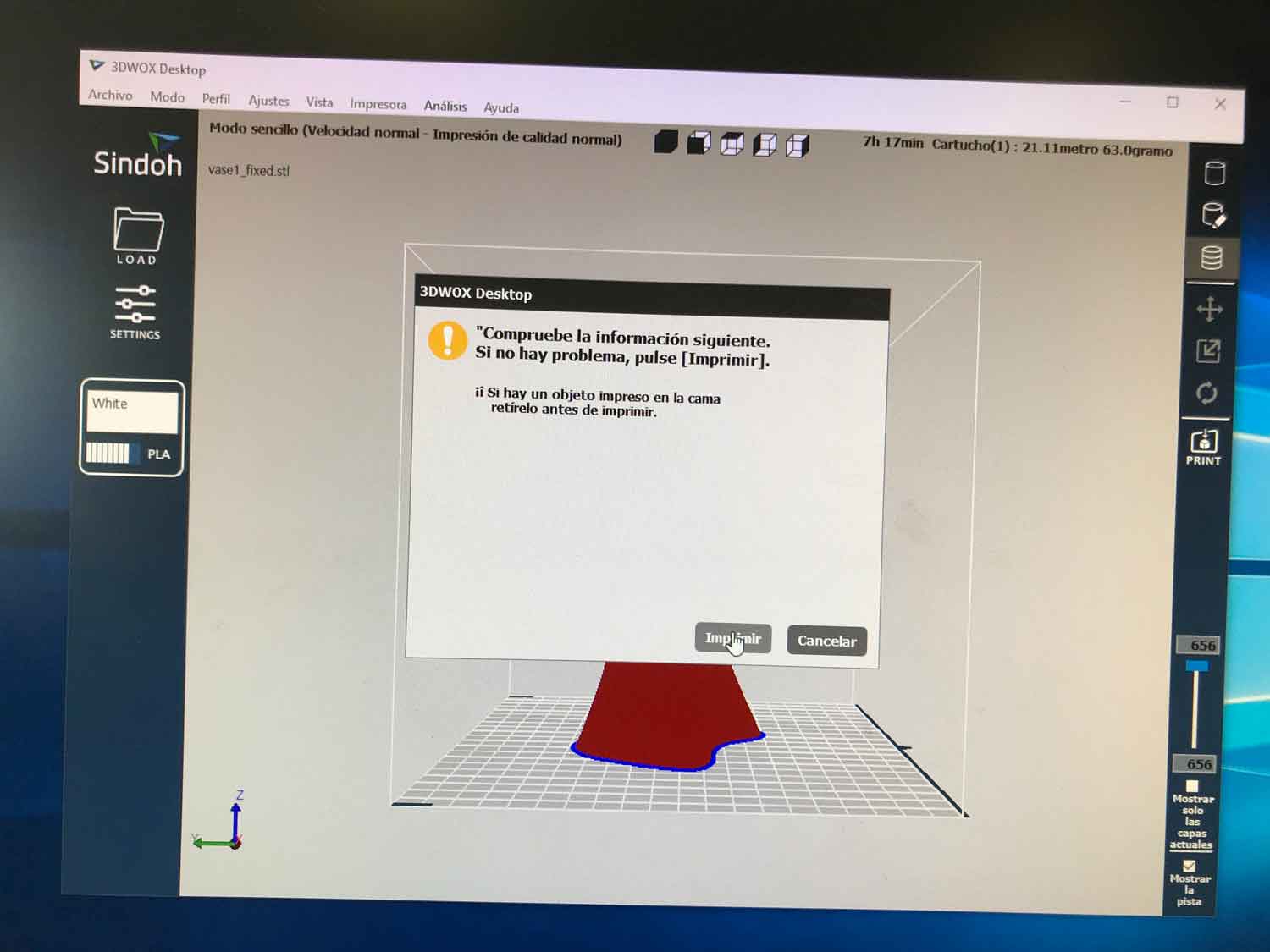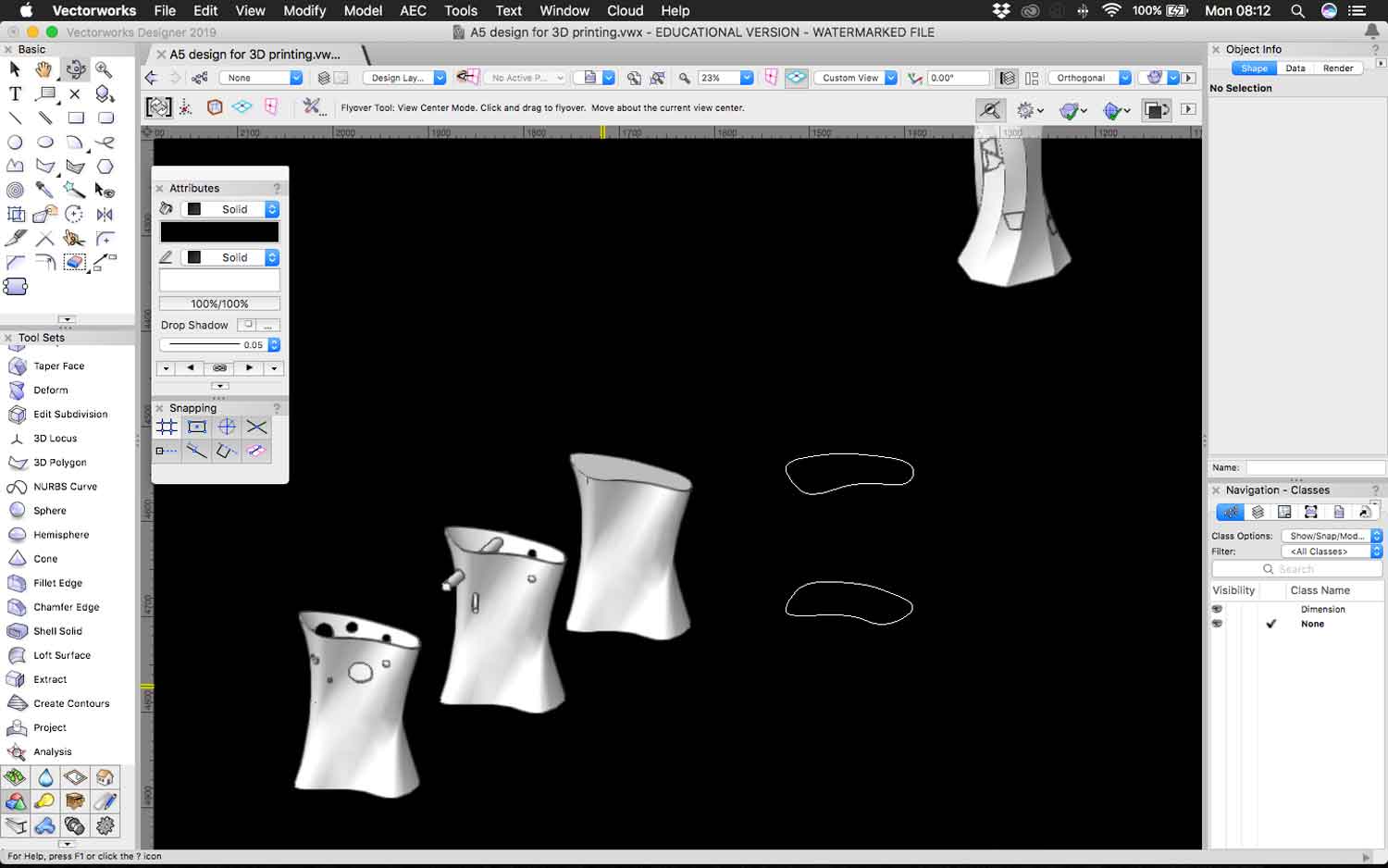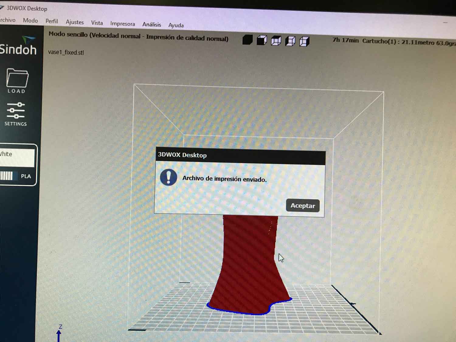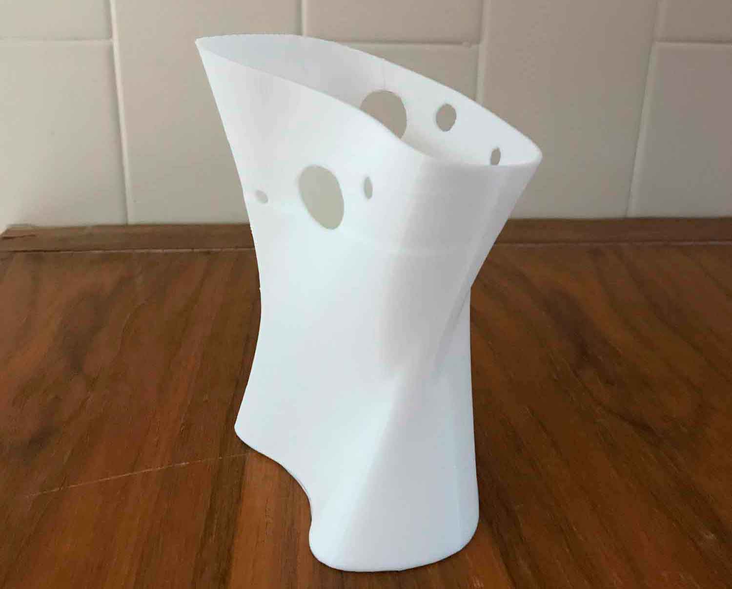 Using Vectorworks I draw an organic 2D irregular form, then I duplicate it and put them in defferent position in the Z axys, Then I convert those irregular forms into NURBS in order to made a LOFT model using the LOFT command to create a 3D solid. After that, with the SHELL command with a 2 mm wall thickness I convert my solid into a 3D Vase object then I substract some cilinders to make some holes in my model, then I export it into a .STL file,  I uploaded the file to NETFABB to get a new verify file to print in 3D. Before start printing my Vase, I opened the file in 3DWOX to set the parameters of printing, of the "supports" , to verify the GCode and to saw the time that the SINDOH 3D printer will spend printing. Here the link to design files: