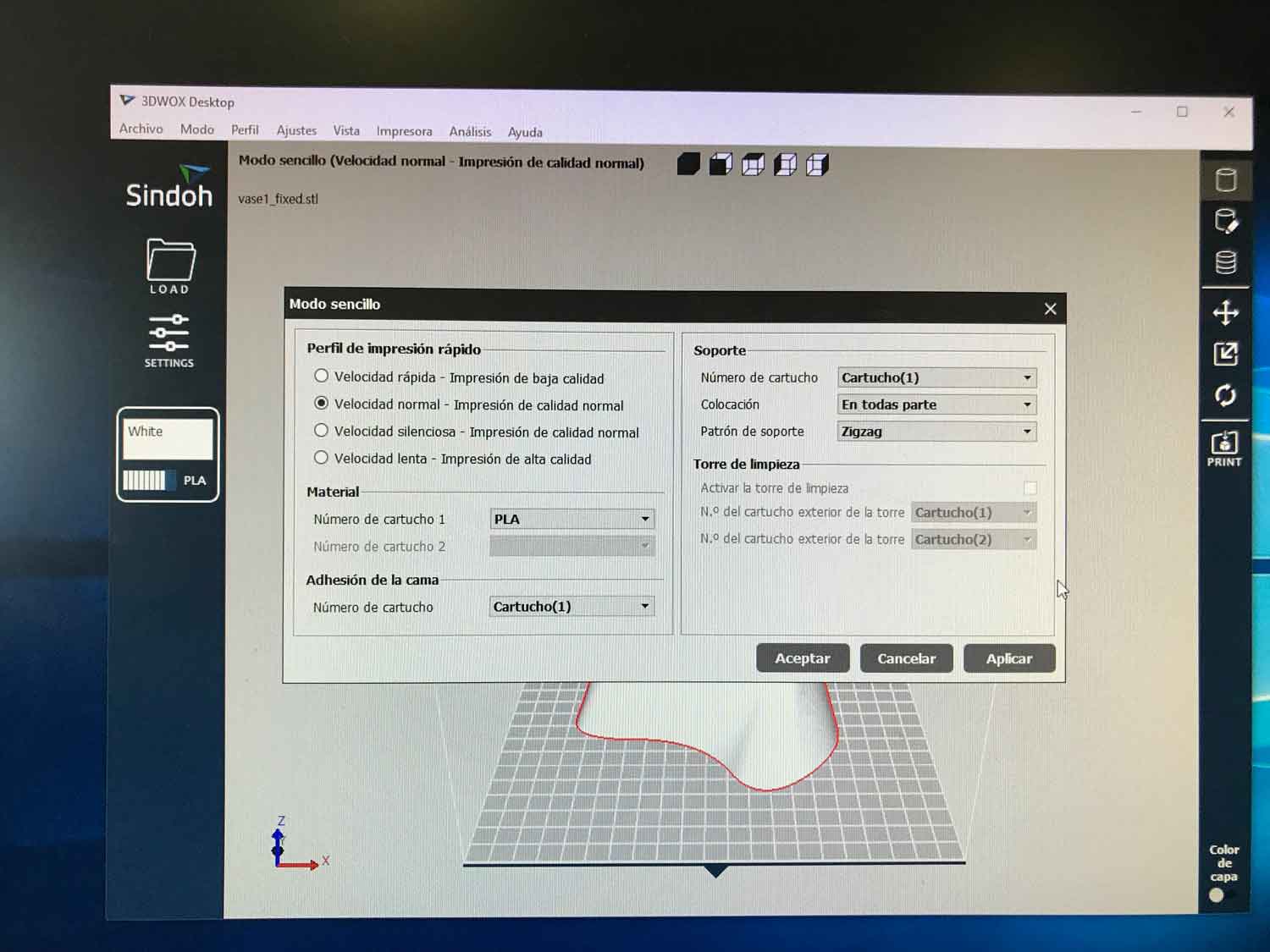 When importing the STL file, we can open the Easy Mode settings window where you can check and change some basic settings like the material, the quality of the printing and where to put the support basically, if you already check your settings in the advanced mode it´s ok to open this window, if not, I recomend to use the advance settings because you have more detail settings to choose from.