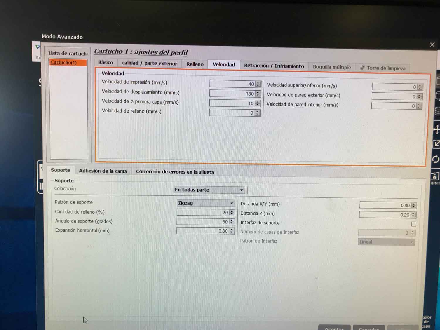 Here is the window of Speed and Support in the advanced settings. The speed of impresion is set to 40 and the displacement speed at 180mm/s for more detail settings depending on the design of the model you are going to print, the inner or outer wall speed becomes critical, but for now the design doesn´t need that kind of detail.