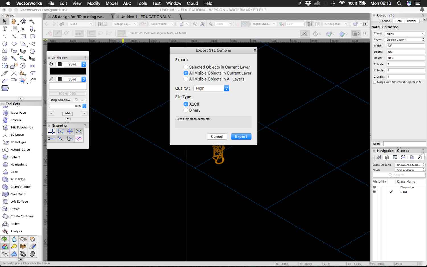 We need to export the 3D shape into a .STL modelo to print it in the 3D printing machine, there are some options when you export the file regarding the objects you see in the layer and the file type; select the ASCII option.