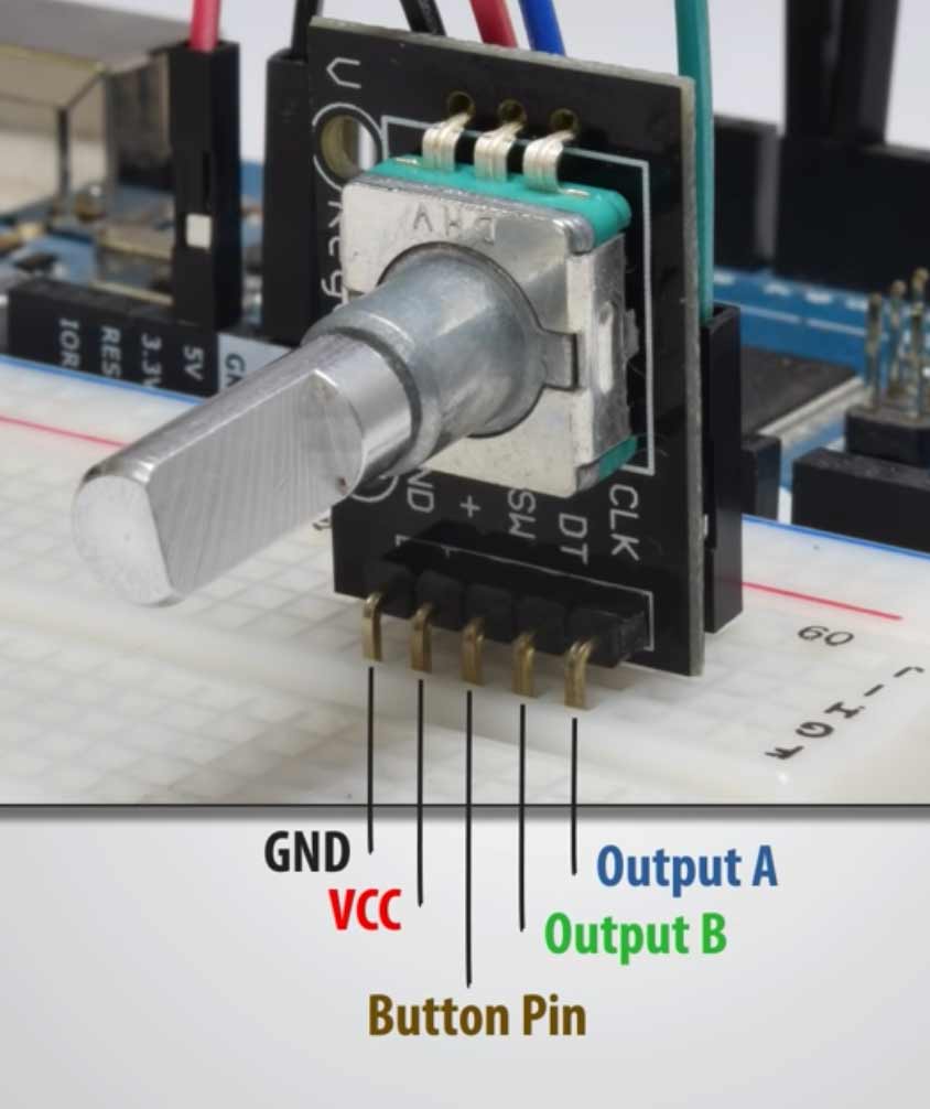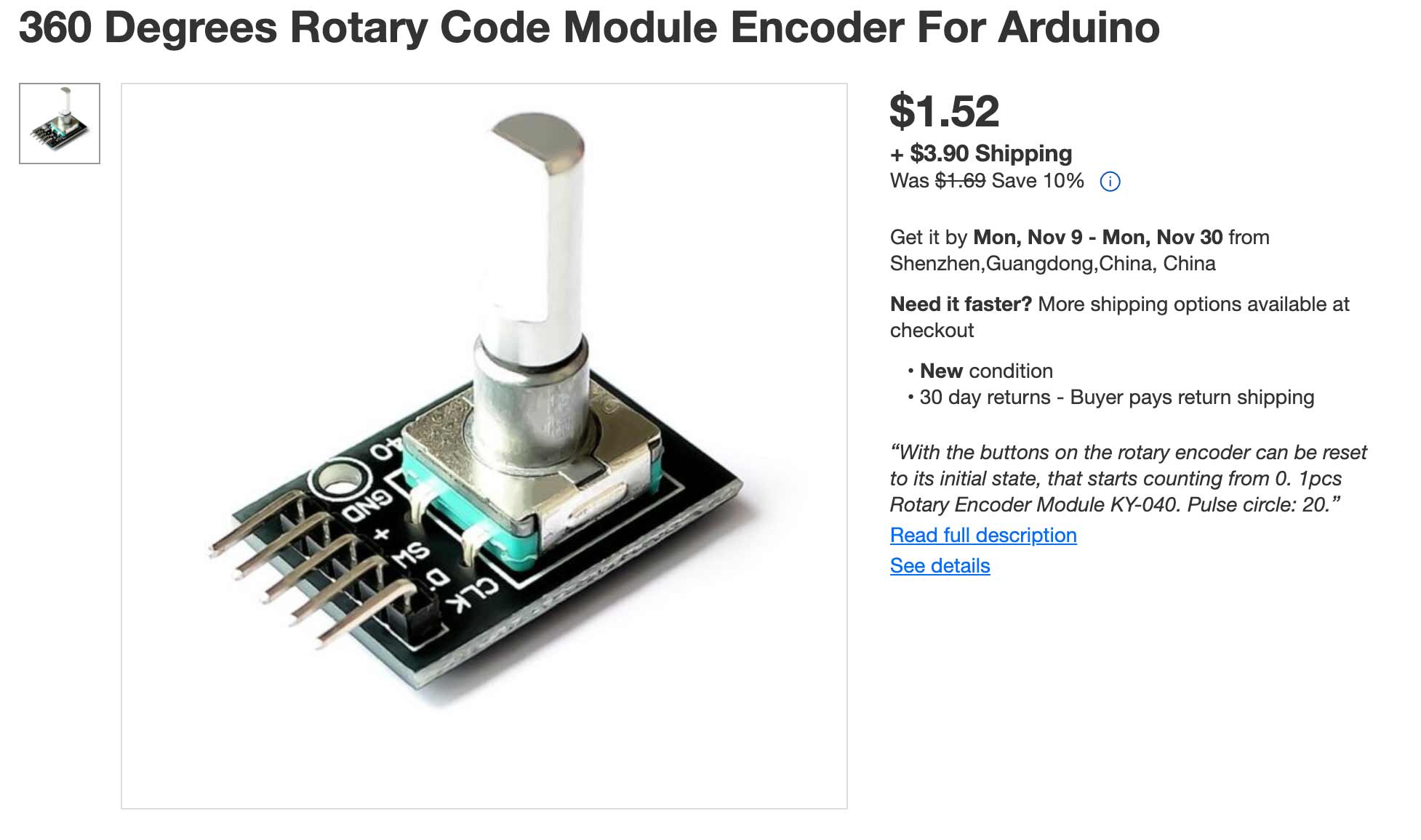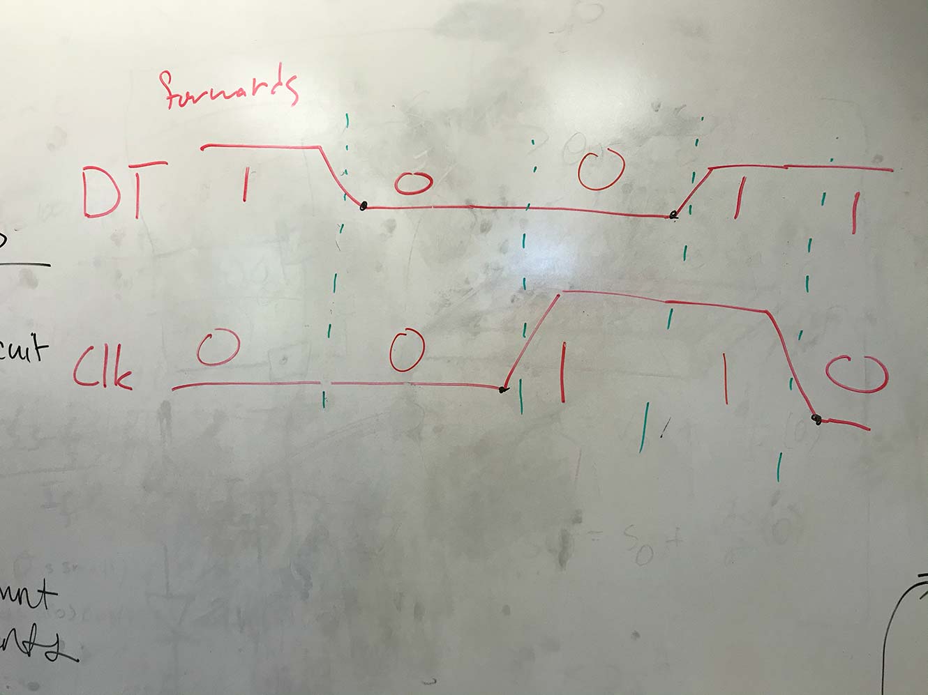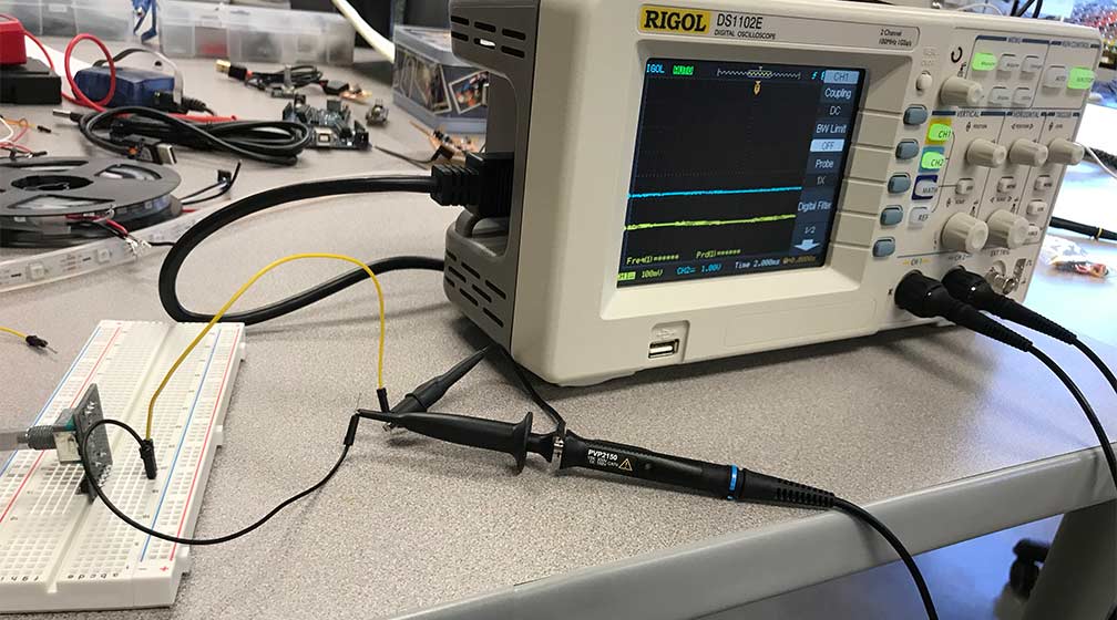 To start, I want to say a student at a lab wheere I work really helped me better understand all of the components I needed to include to make this happen and I couldn't have gotten to this point (or it would have been a while longer) without picking his amazing brain! There are lots of different kinds of rotary encoders and you can make your own. A rotary encoder is a device that converts the angular position or motion of a shaft or axle to analog or digital output signals. I chose this type of input because I want the mechanism by which the color changes to be something along the lines of physically turning a knob... I realize there are many other ways I culd have done this but I ultimately decided to go in this direction. There are five pins to a rotary encoder: CLK for click (output A), DT (output B), SW for switch, + (vcc), and GND for ground. To begin, I wanted to try doing this with an Adruino and that meant CLK and DT needed to go to digital pins 2 and 3 and SW could go anywhere. I collected some supplies to get going which included a breadboard, jumper wires, and the rotary encoder itself. The first question though was does the rotary encoder have bounce. More on debouncing here. Switch bounce is literally bounce... most components I would use don't have good electro magnetic contact. Big cheap switches can have a waveform that can be somewhat eratic even with the span of a milisecond. Bounce in a mechanical switch can mess up an interrupt service routine in a microcontroller which we'd like to avoid. Some rotary encoders something in the them that eliminates most of the bouncing. If it doesn't have debouncing then we will need to add some small capicitors. The way we find this out is to use an oscillioscope.