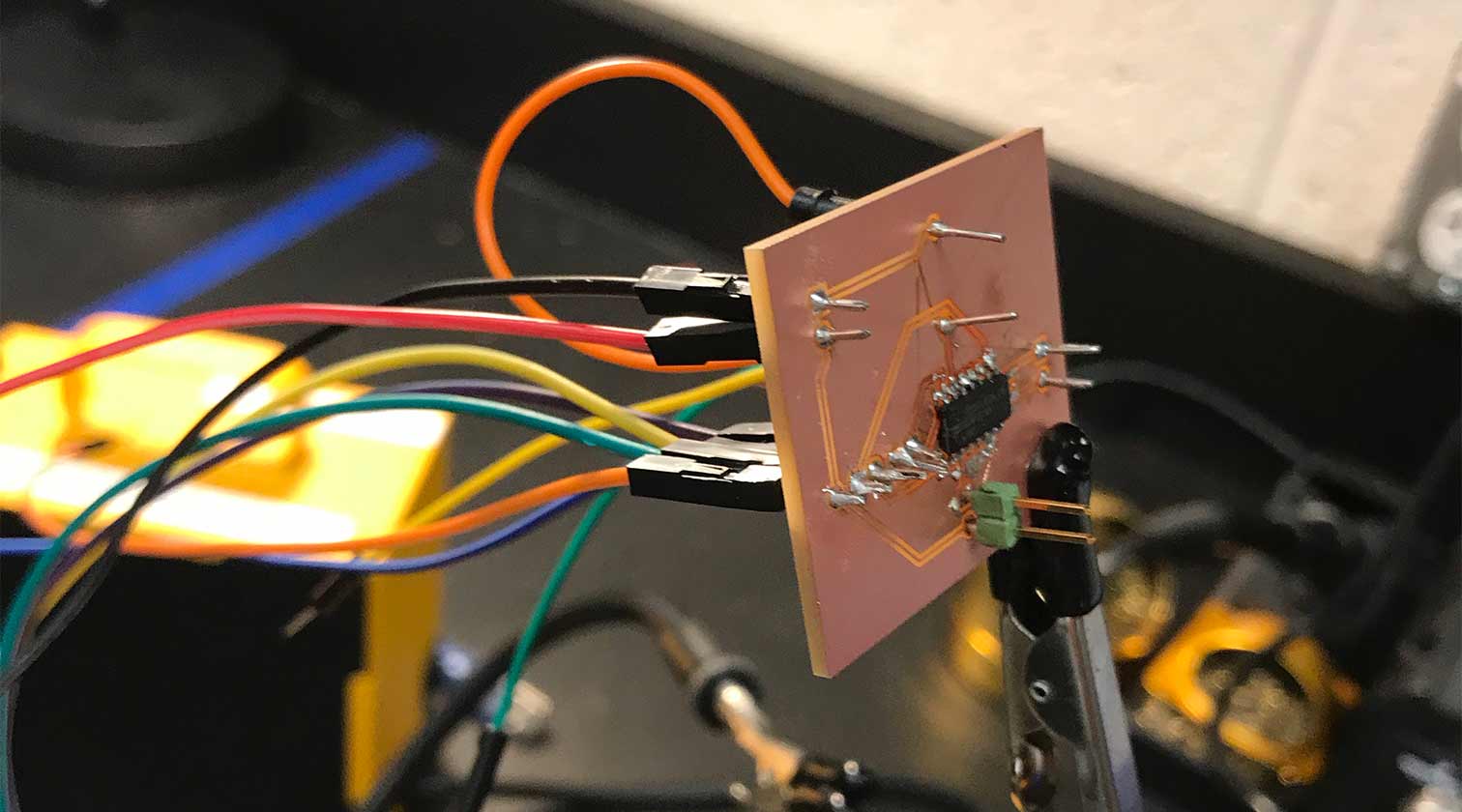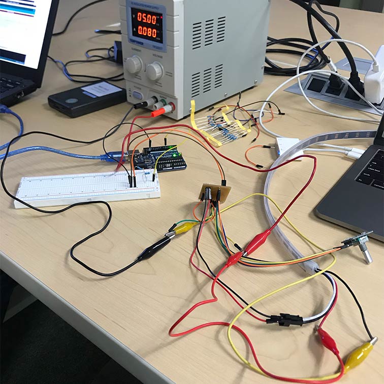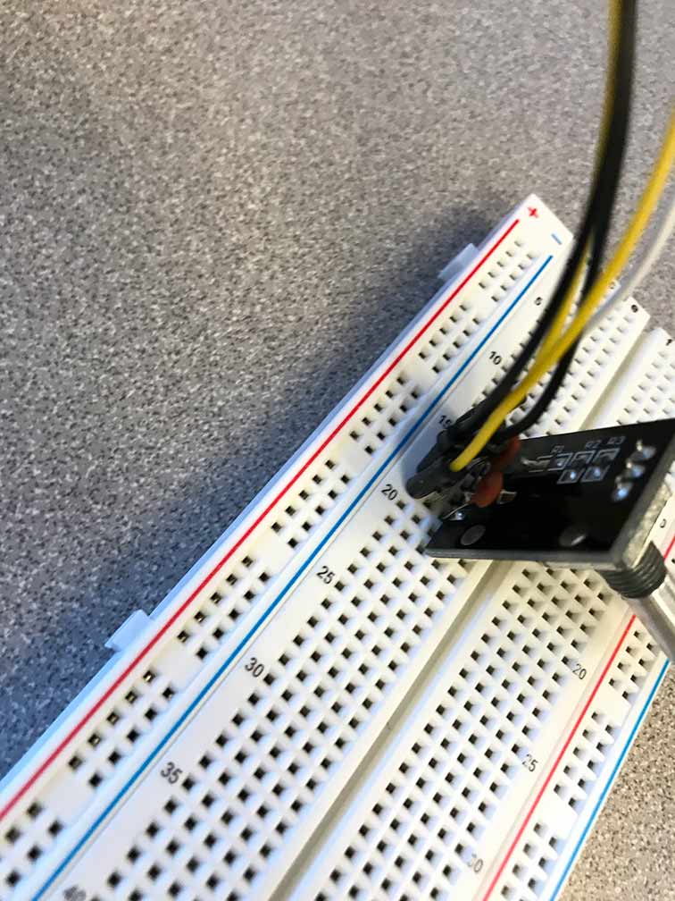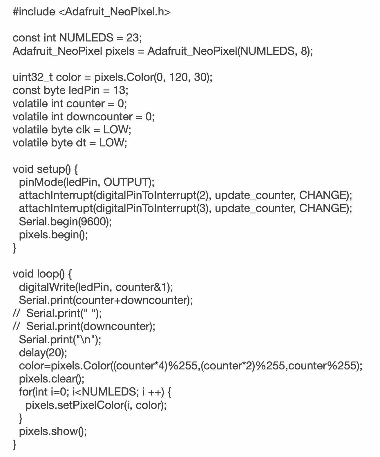 To start, I want to say a student at a lab wheere I work really helped me better understand all of the components I needed to include to make this happen and I couldn't have gotten to this point (or it would have been a while longer) without picking his amazing brain! There are lots of different kinds of rotary encoders and you can make your own. A rotary encoder is a device that converts the angular position or motion of a shaft or axle to analog or digital output signals. I chose this type of input because I want the mechanism by which the color changes to be something along the lines of physically turning a knob... I realize there are many other ways I culd have done this but I ultimately decided to go in this direction. There are five pins to a rotary encoder: CLK for click (output A), DT (output B), SW for switch, + (vcc), and GND for ground. To begin, I wanted to try doing this with an Adruino and that meant CLK and DT needed to go to digital pins 2 and 3 and SW could go anywhere. I collected some supplies to get going which included a breadboard, jumper wires, and the rotary encoder itself. The first question though was does the rotary encoder have bounce. More on debouncing here. Switch bounce is literally bounce... most components I would use don't have good electro magnetic contact. Big cheap switches can have a waveform that can be somewhat eratic even with the span of a milisecond. Bounce in a mechanical switch can mess up an interrupt service routine in a microcontroller which we'd like to avoid. Some rotary encoders something in the them that eliminates most of the bouncing. If it doesn't have debouncing then we will need to add some small capicitors. The way we find this out is to use an oscillioscope.
