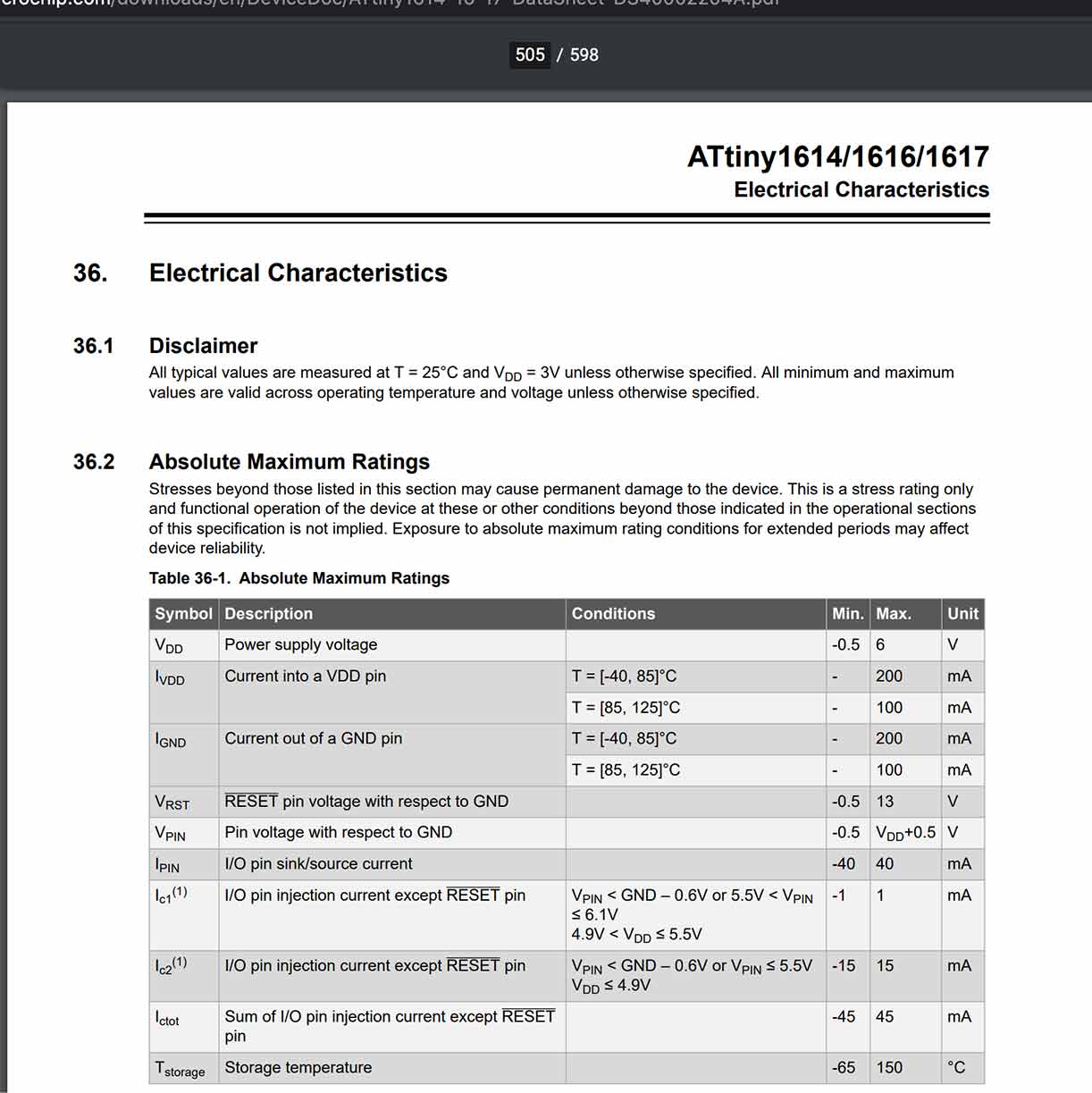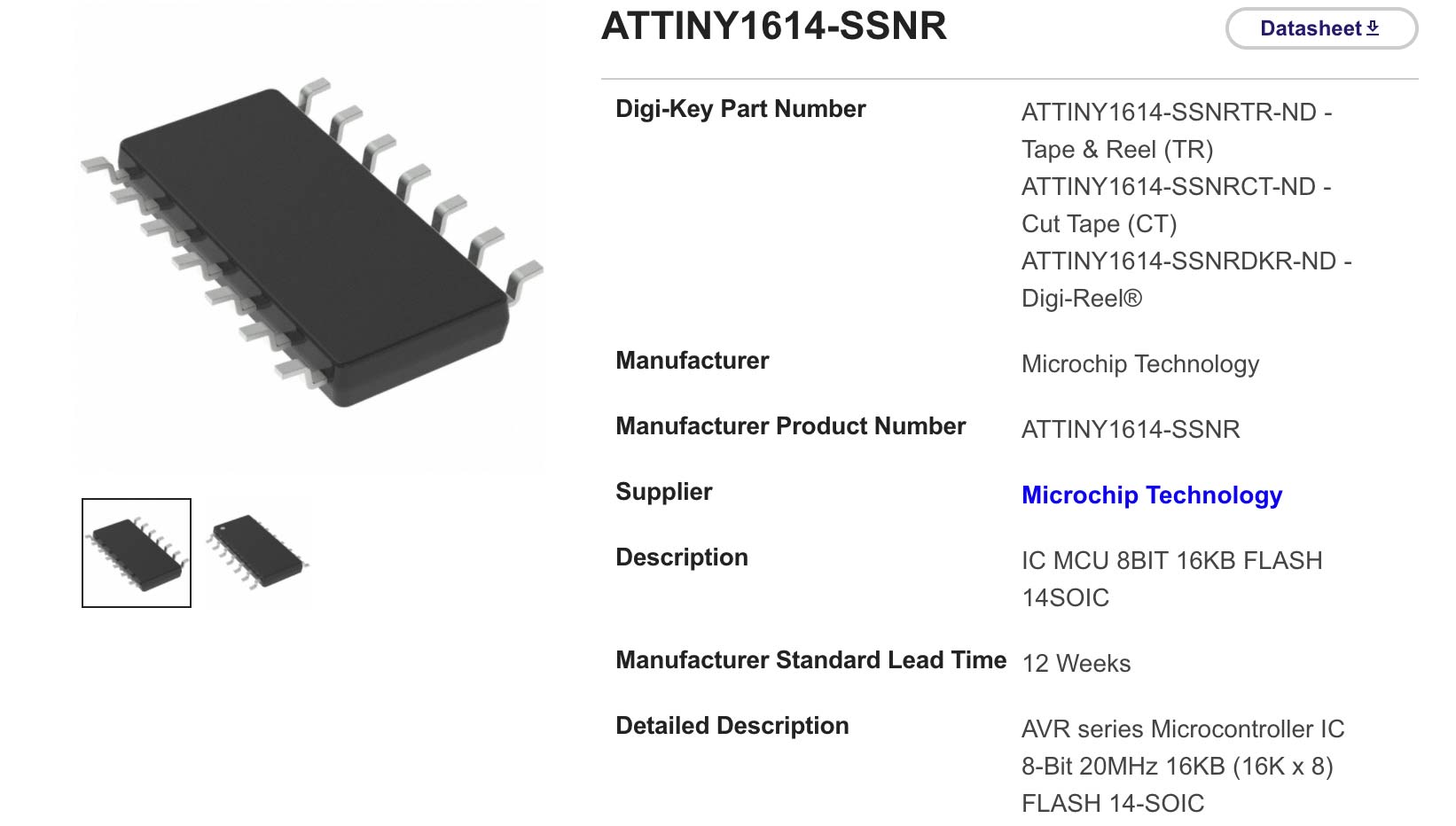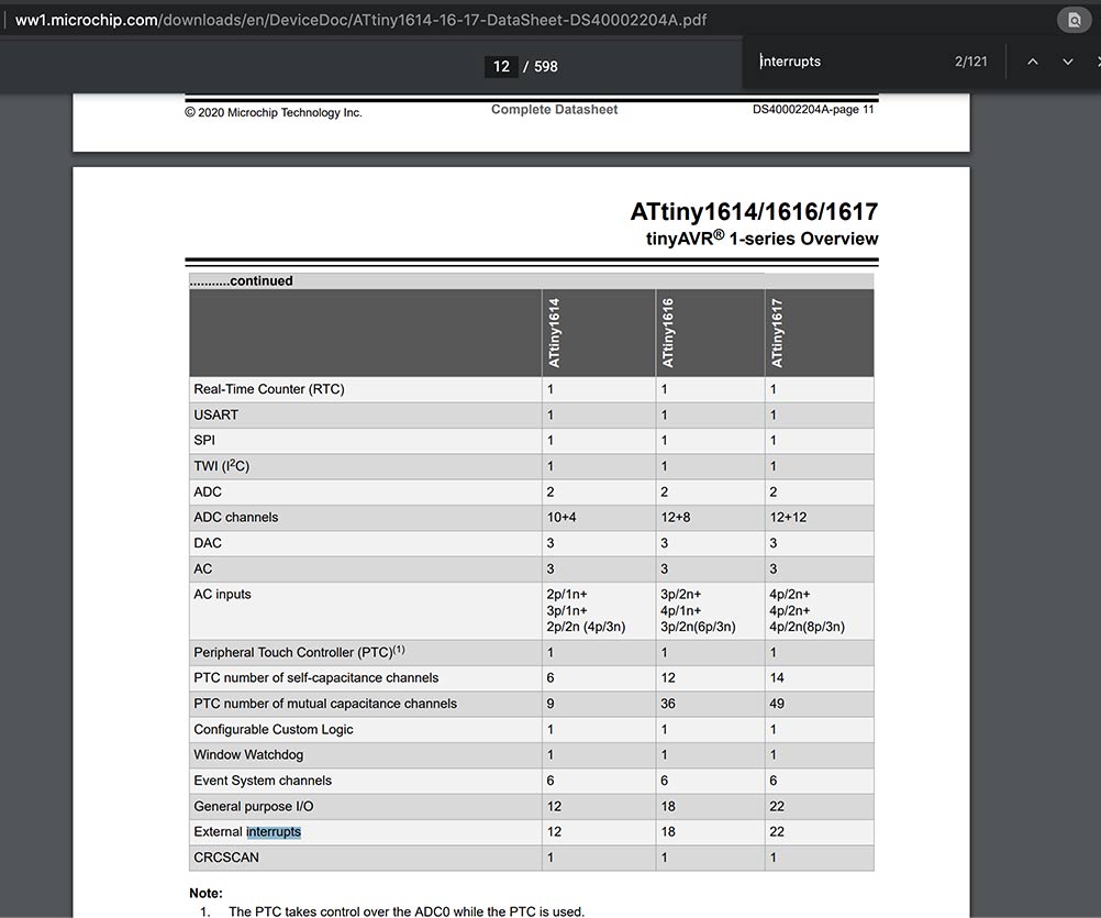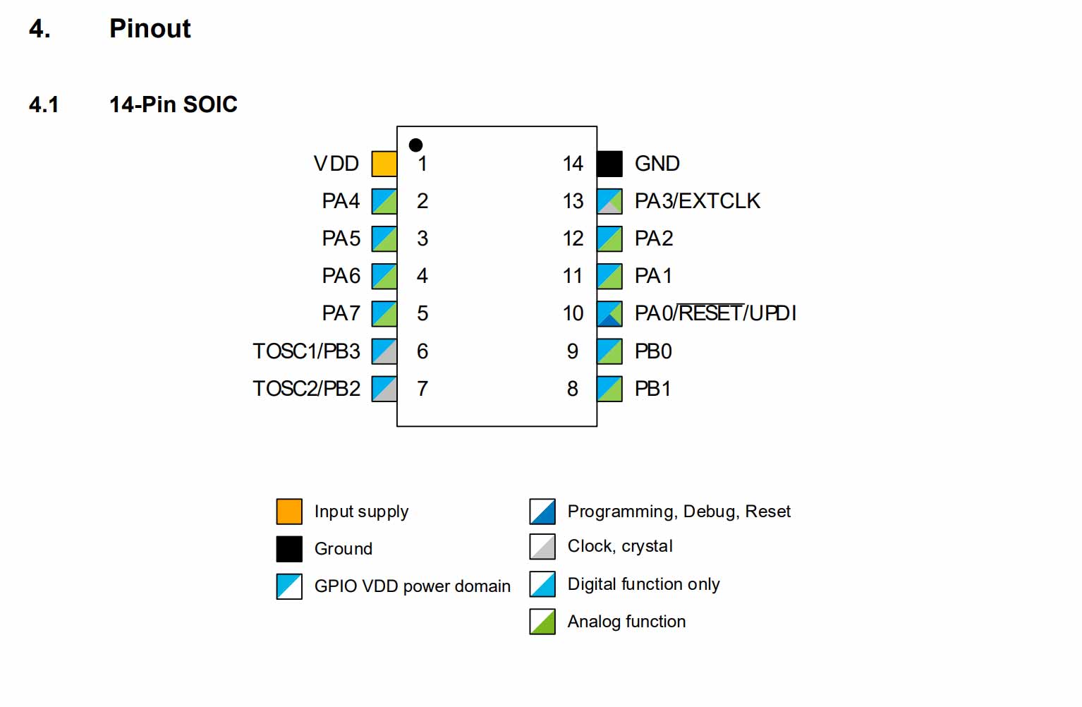 I had the AtTiny1614 on hand and decided to go with it. I then had to find a few things out from the datasheet.