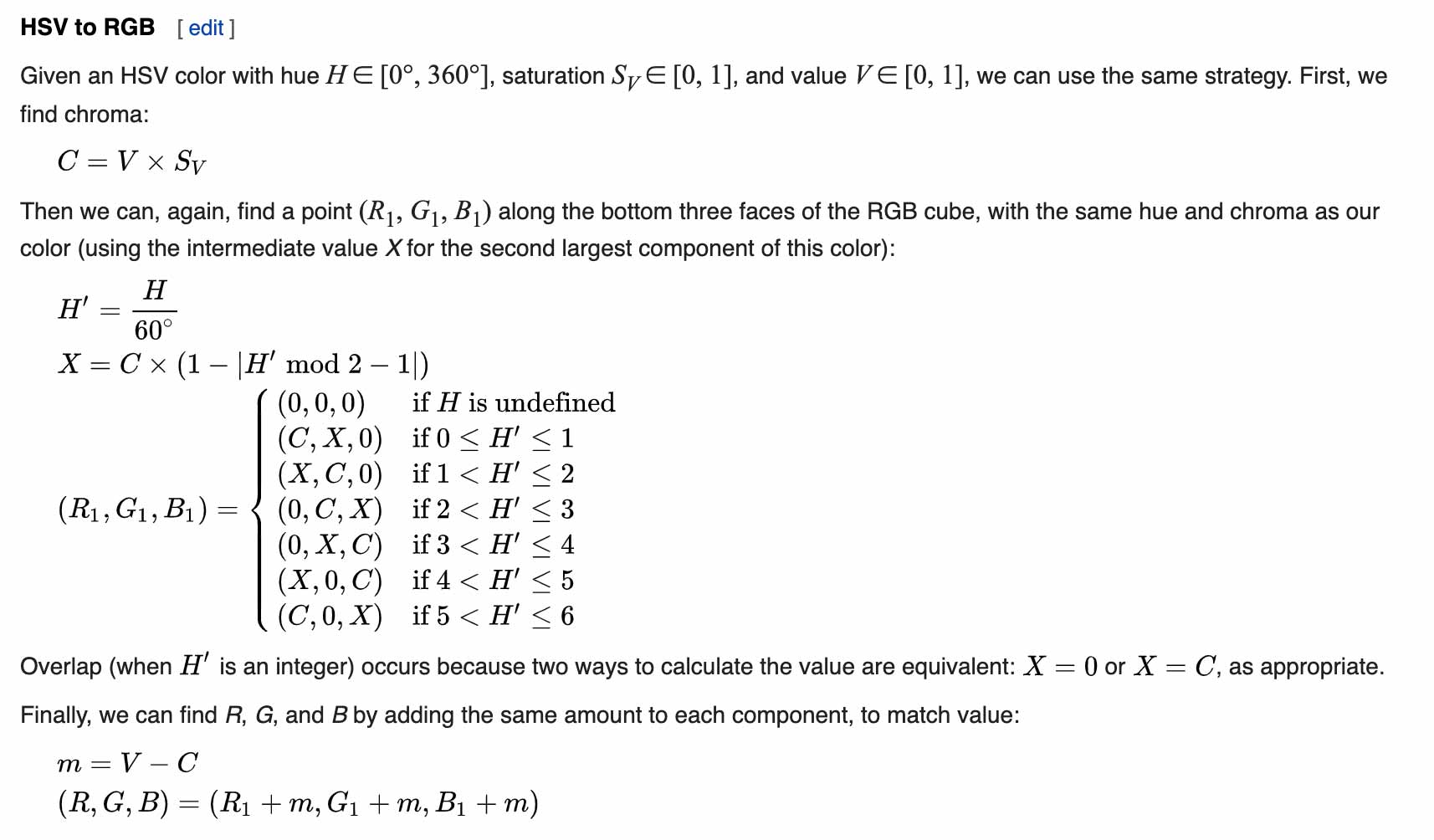 So I originally just thought to use RGB because that's all I knew to use. Turns out RGB isn't ideal for what I'm trying to do. The video above is what my neopixels look like when I use code rooted in RBG. I researched this and started learn more about other color models and color spaces here. I then decided to try out HSL or HSV. HSL (hue, saturation, lightness) and HSV (hue, saturation, value, also known as HSB or hue, saturation, brightness) are alternative representations of the RGB color model. Turned out the best information I could find was on this Wikipedia page.