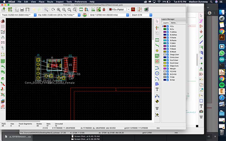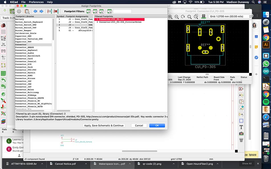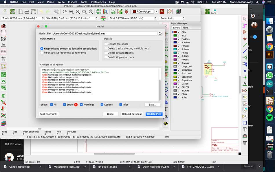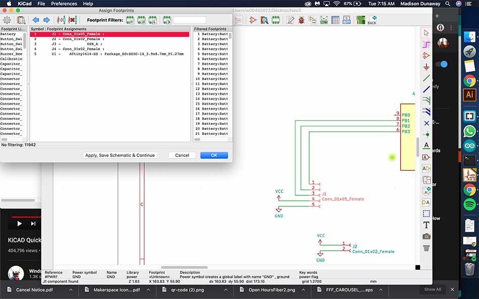 So I did watch a few tutorials about KiCad since this was my first time using it and honestly most of them wern't helpful because they were from a past version and apparently it s changed quite a bit. So of course, as you can see above, I started running into alot of errors.