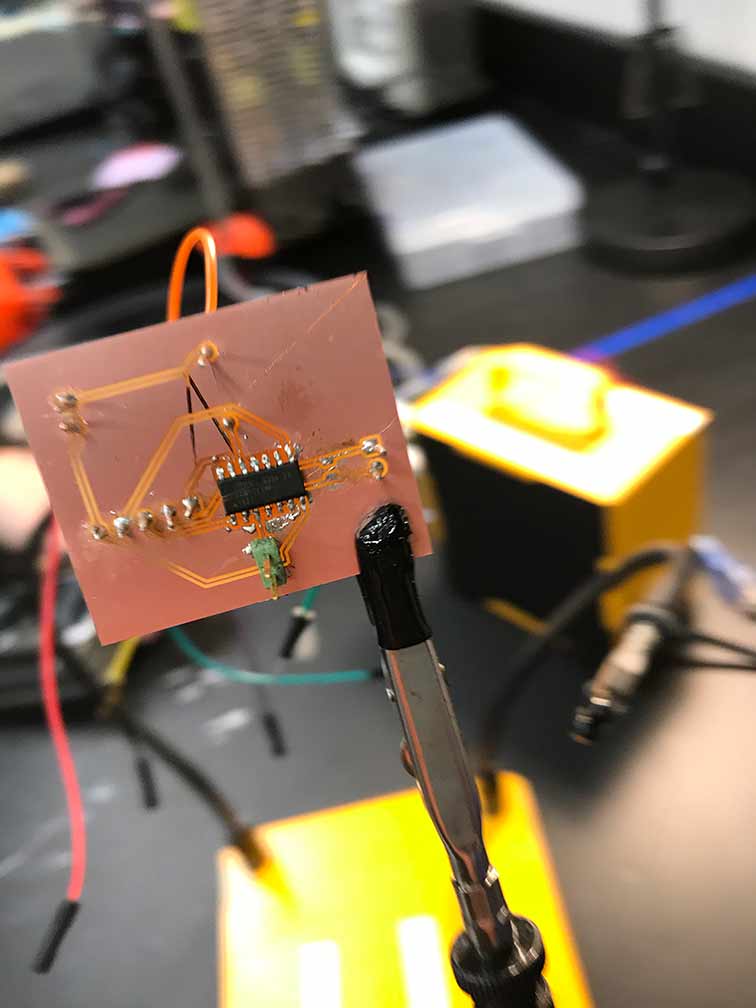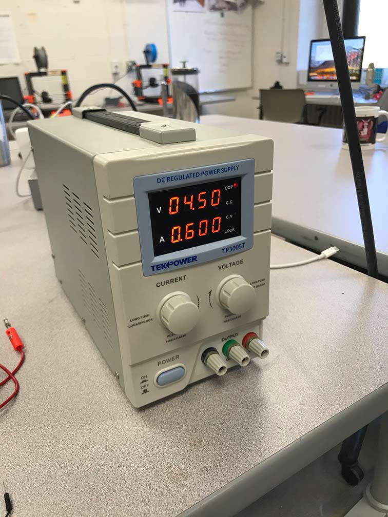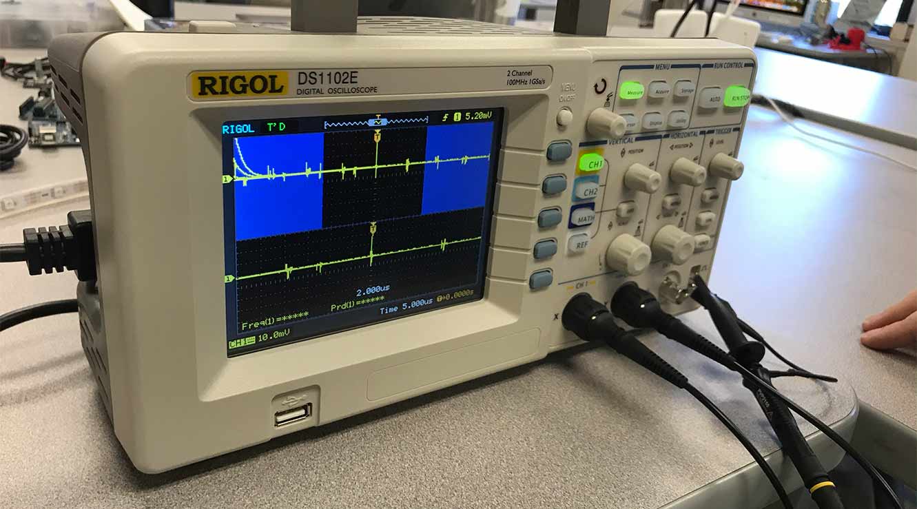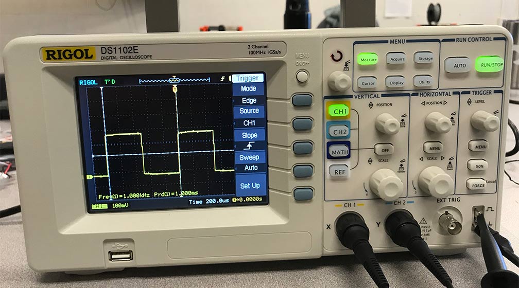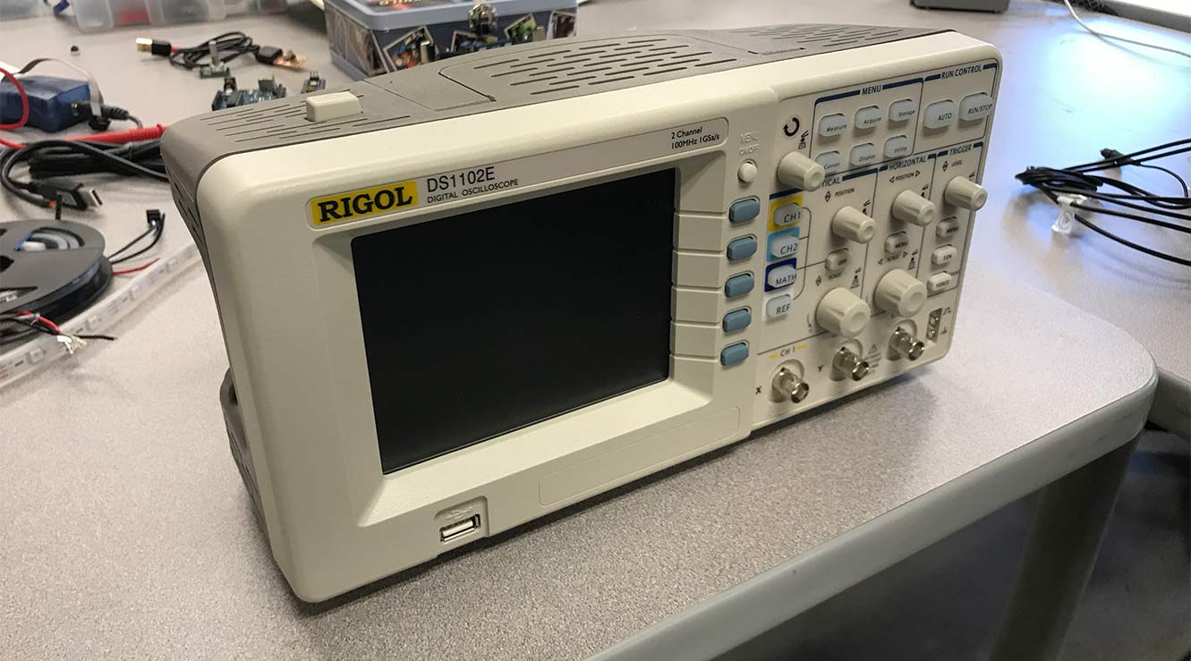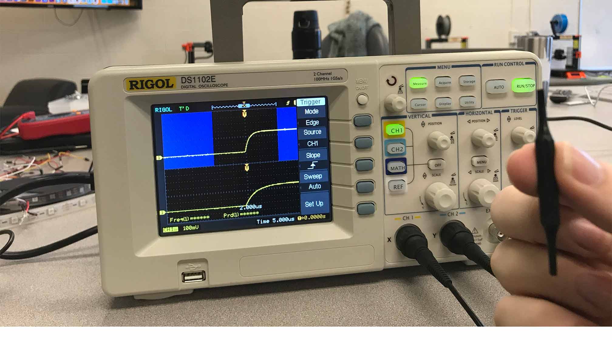 So I had never used an oscillioscope before today so i looked it up... "An oscilloscope, previously called an oscillograph, and informally known as a scope or o-scope, CRO, or DSO, is a type of electronic test instrument that graphically displays varying signal voltages, usually as a calibrated two-dimensional plot of one or more signals as a function of time." - Wikipedia. Let's break that down... they are kinda like a really dope multimeter that just samples voltage like a million times per second... with a screen and you can also export data (csv or png file) you can also modify the resolution of your voltage sample. This is a digital one which is great because it doesn't take forever to warmp up. The one in our lab is a RIGOL rated at 100megahertz... it seems like once you get past that, these get pretty expensive. We added some colorful rings called marking bands to keep track of what we were hooking up. There are two channels and an external trigger (which is not an aquisition channel) you can set up.