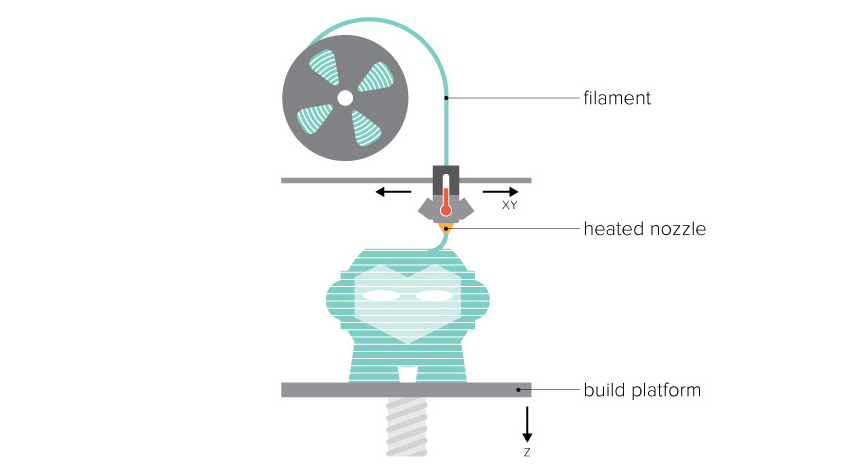 FDM stands for Fused Deposition Modeling and it is the most widely used form of 3D Printing. FDM is actually trademarked so alot of printers that say they are FFM are just dodging patents. Imagine you have a hot glue gun and want to make a model... you lay hot glue down... wait for it to try... and then lay another layer down. A solid role of filament is fed through a hot cartiridge and then through a heated nozzle and then laid down in a predetermined path.