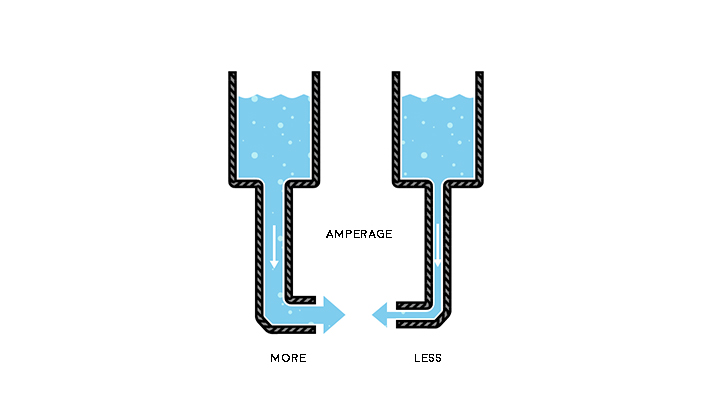 Current is measured in Amperes (usually just referred to as "Amps") and is represented as an I in equations. On the left, the tube is bigger and on the right it is smaller. More water is running through the one on the right; higher current.