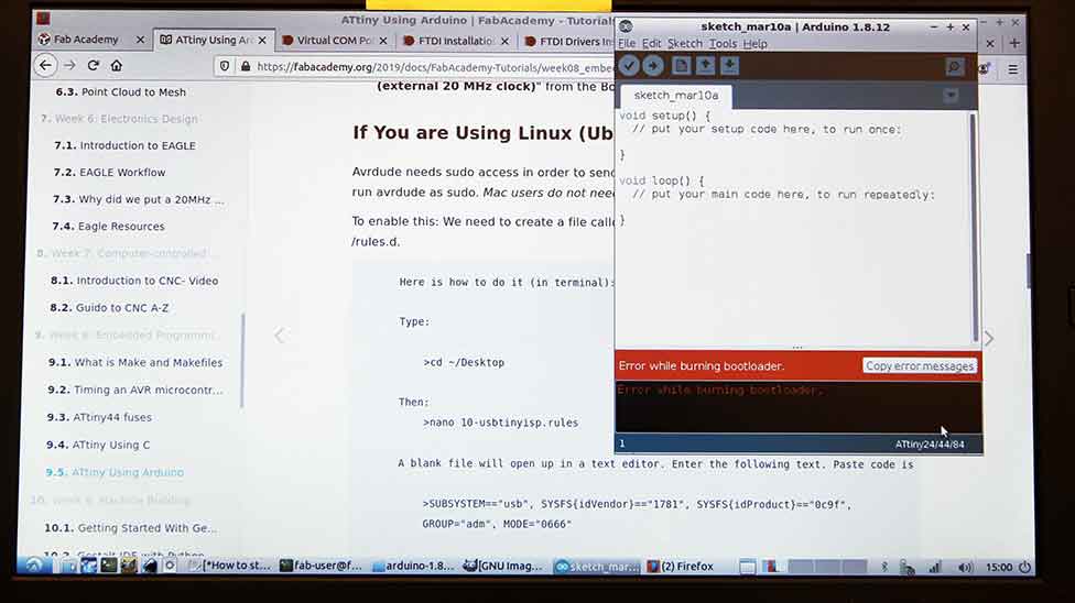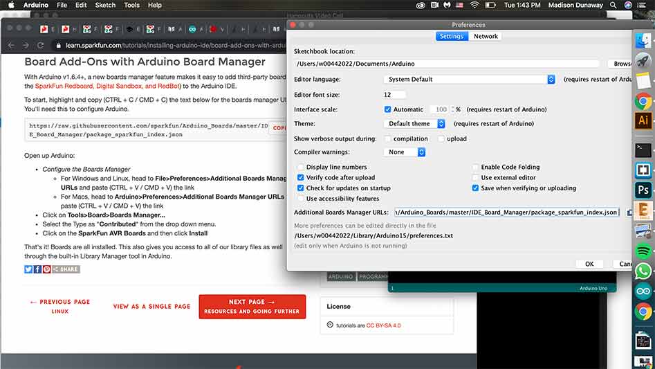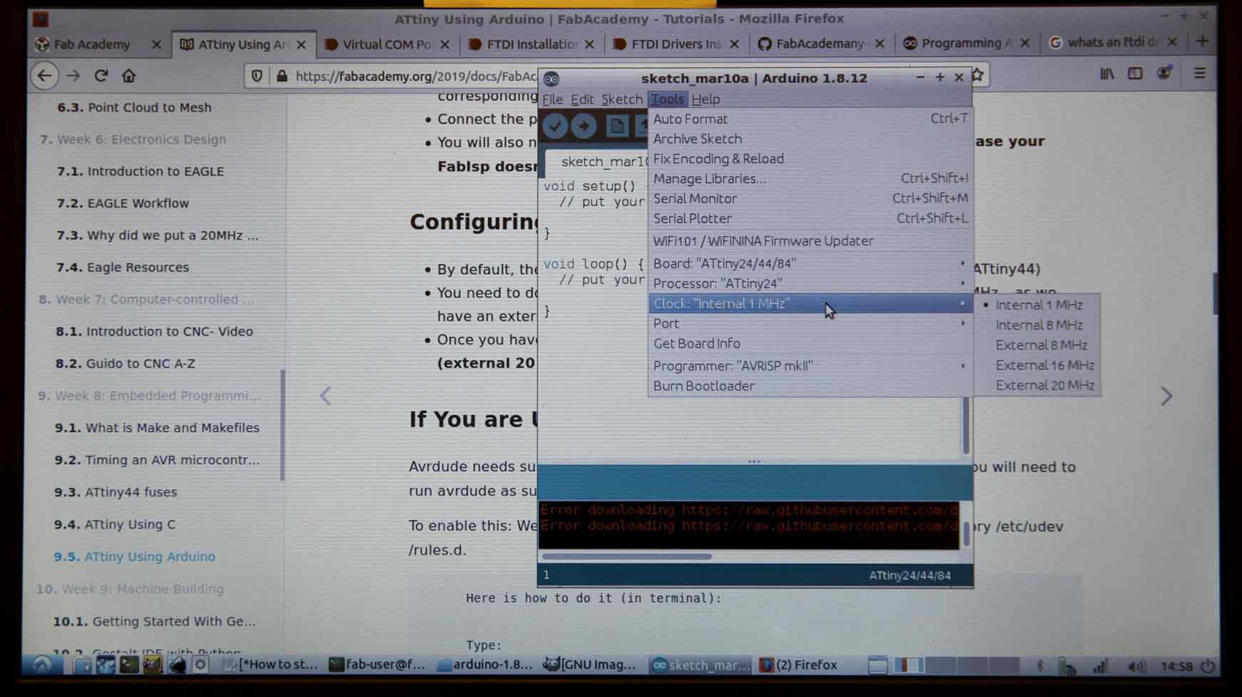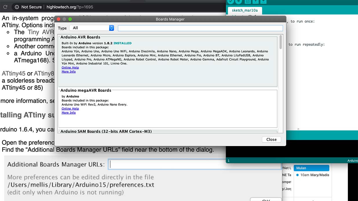 This is where I started getting even more lost. I ended up going to Lena Park where our FabAcademy teacher works to get help. Starting now, the journey I took may get a bit convuluted, poorly documented, and confusing so I'm going to do my best to list the sites I am learning from. This tutorial is the first one. From there, I jumped to Saba Ghole's site who was a 2018 student and has in depth documentation. Thanks Saba! I impulsively downloaded Arduino and then dove into High Low Tech's tutorial. I soon realized I needed to add a new board... right?