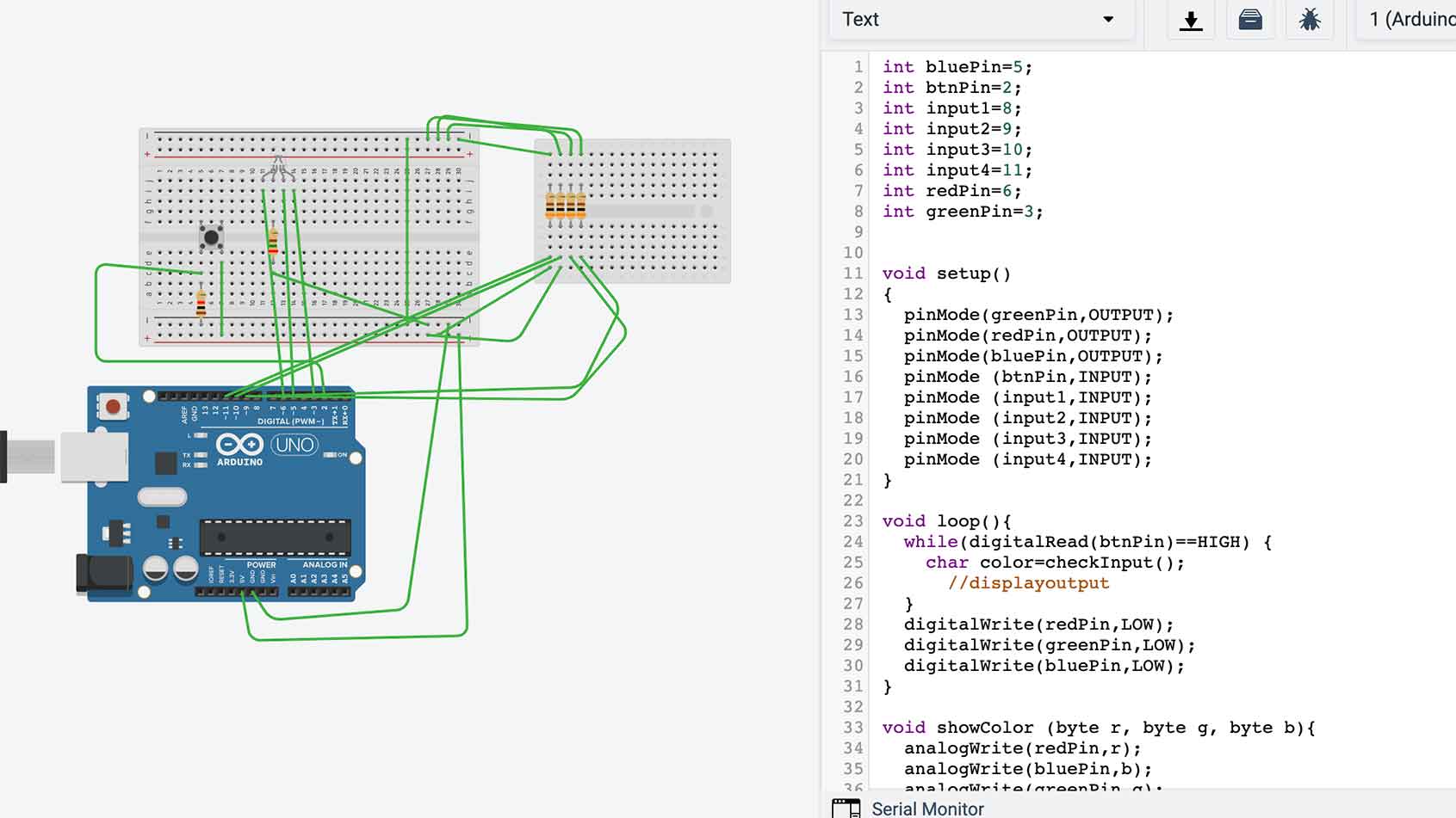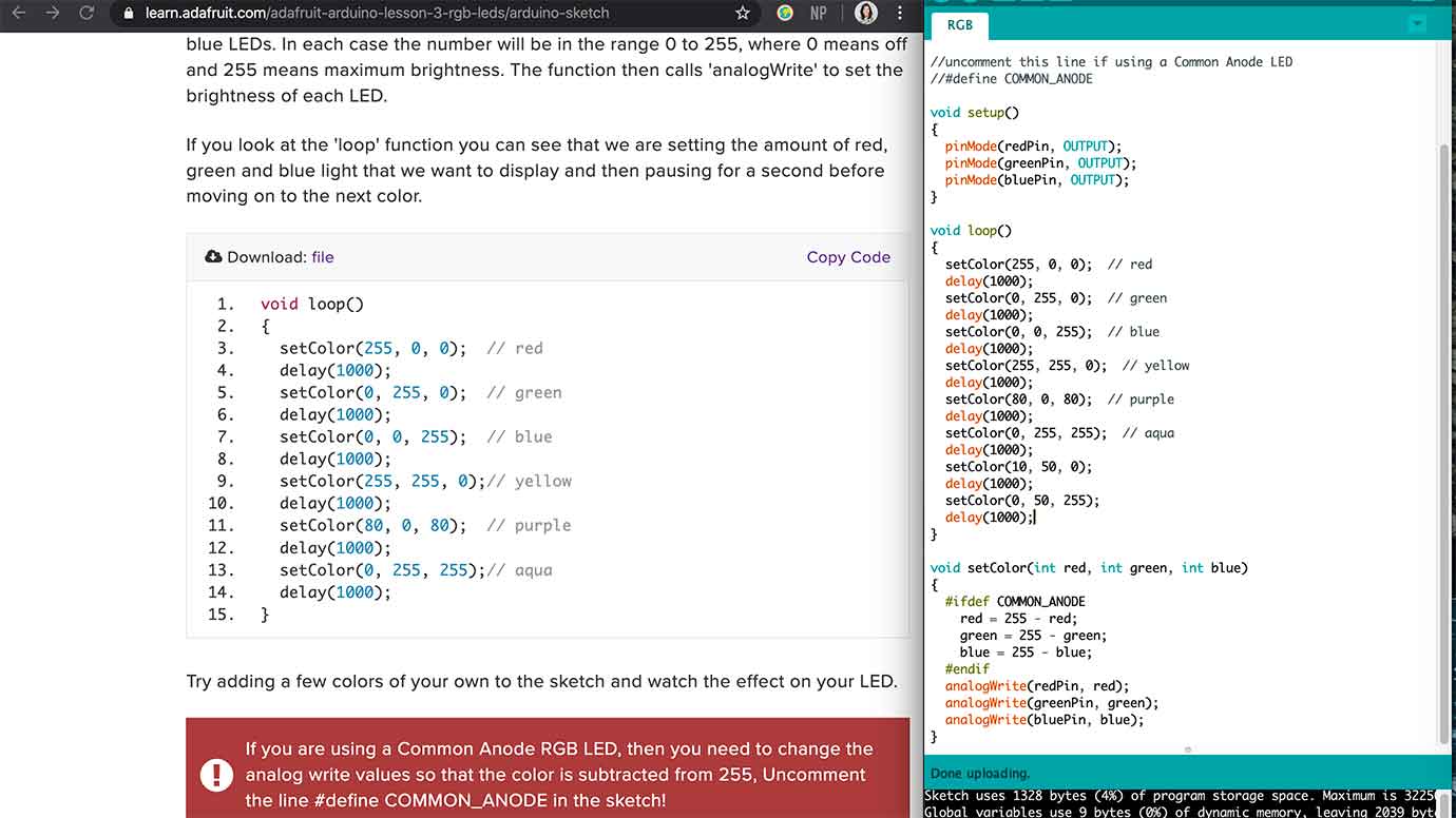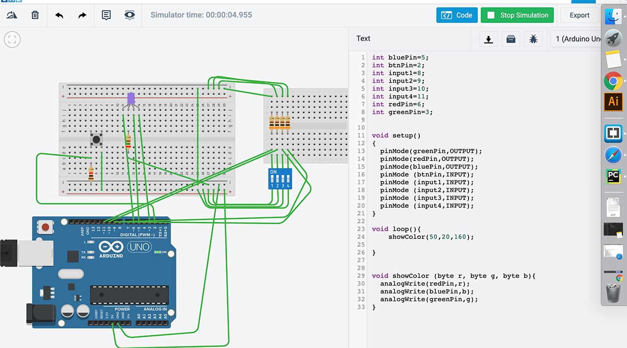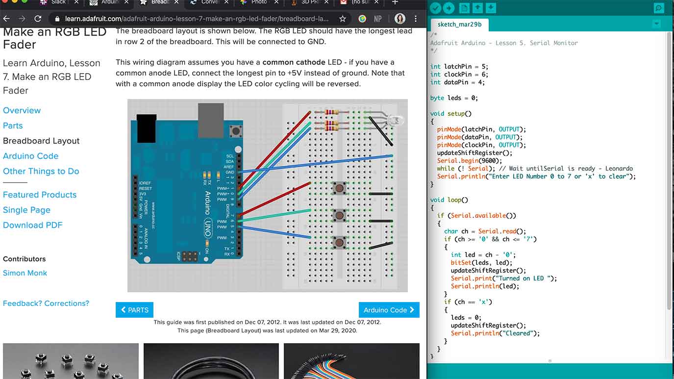 This week we were in about week three of shelter in place. It's pretty tough to not be able to leave the house... kind of driving everyone insane. This week I explore with Tinkercas circuits and tried to focus on working with LEDs and RGB LEDs since my actual output in my realy final project is going to be neopixels. This is very different than working with neopixels but I think the experience I'm getting this week is really more foundational level work with Arduino IDE and also with understanding simple output devices and how to code for them. All in all, it was a pretty good week and I'm hoping I can implement what I've learned for my final project.