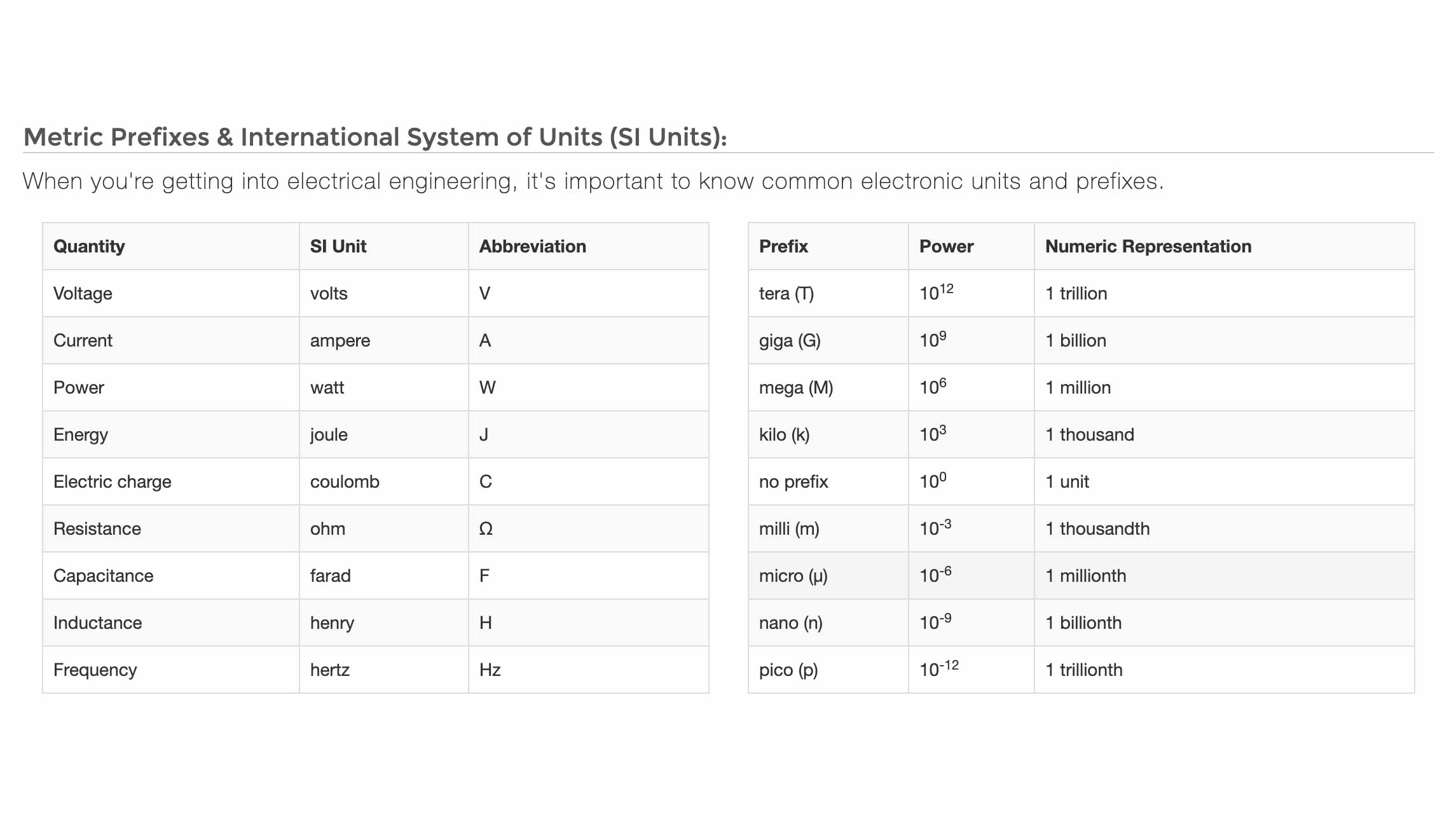 This is another great page on Sparkfun that goes over Metric Prefixes and SI Units.