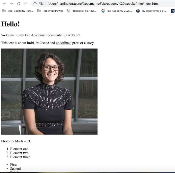 Using markdown files allows me to use also html sintax. I had no clue of html before either, but I found it useful to learn about it because there is a lot of good documentation online and after all this is what markdown documents are turned into in order to be shown online. I followed the tutorial provided in the Fab Academy tutorials’ page and created by first .html page. I find it super useful to be able to see the page on the browser immediately, without passing through the remote repository. This is my first html page: