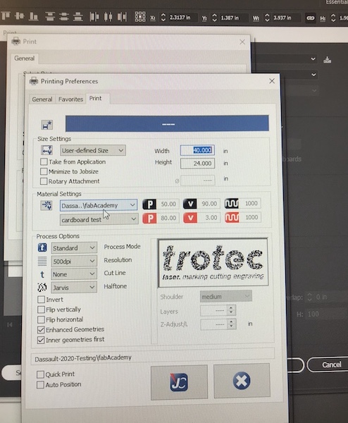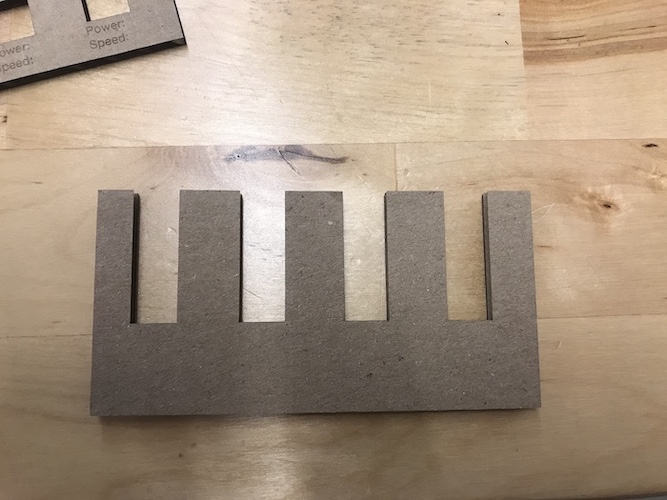 Regarding the power and speed, we first tried the standard settings of the machine for cardboard and realised the power was actually too strong (the cardboard got on fire…). So we tested out some different settings until we found those that worked best for cardboard: * Power: 80; * Speed: 4; * Rate: 1000.