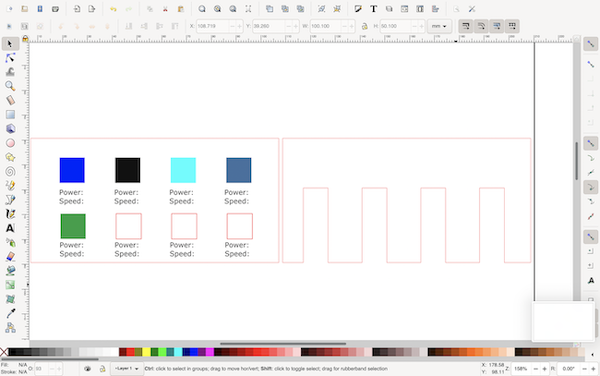 We put the settings into a new FabAcademy profile of the machine so we could try out other settings and create new profiles for the differnet materials. I wanted to try some engraving settings to find the best one. So, first of all, I created a settings palette in the profile and then created a file with some square of differnet colours (reflecting the palette).