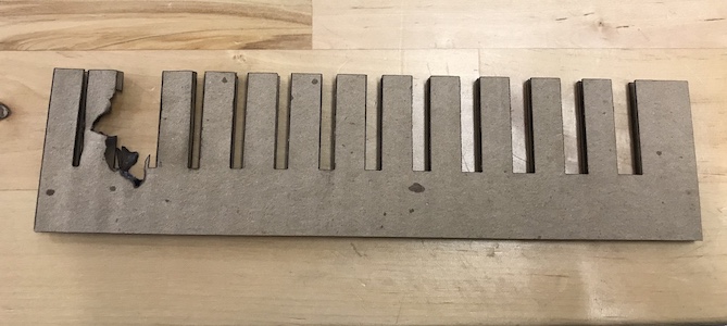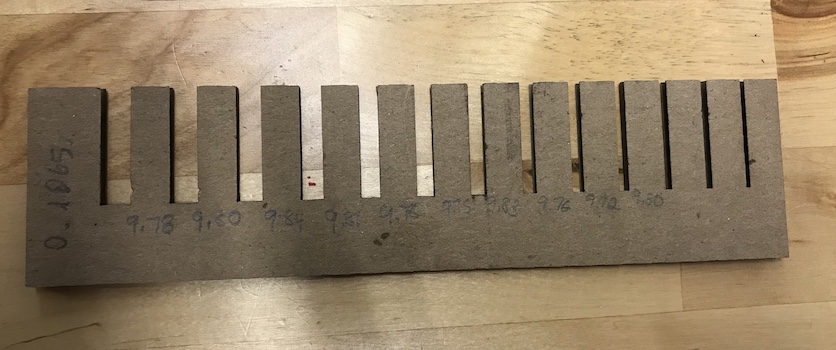First of all, we cut a piece of cardboard to measure the kerf of our machine. We set up a series of columns of 1cm and measure each of them after cutting. On average for the 10 pieces the kerf was 0.1065mm, although it was slightly different for each of them.