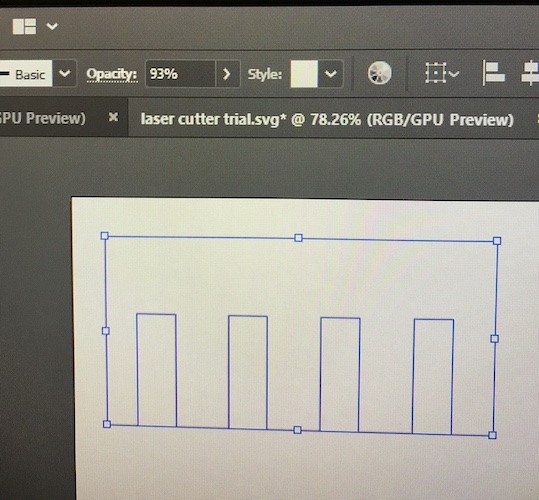 When I tried to cut it, I figured out there was a BIG problem with importing a file created with inkscape. It took me 2 hours to figure out what it was and then I realied it was the ‘opacity’ settig that, for some reason, automatically went to 93% instead of 100%, making it impossible for the laser cutter to recognise the colour for cutting or engraving. I then sent the file to print using illustrator. Important things to remember in the settings are to use ‘used defined paper’ (and make sure that the size of the paper is lower than the one of the laser cutter place –> otherwise it gives an error) and put place the model on top-left. Then I need to select the right material by clinking ‘setup’ and click print both in the setup page and in the settings page.