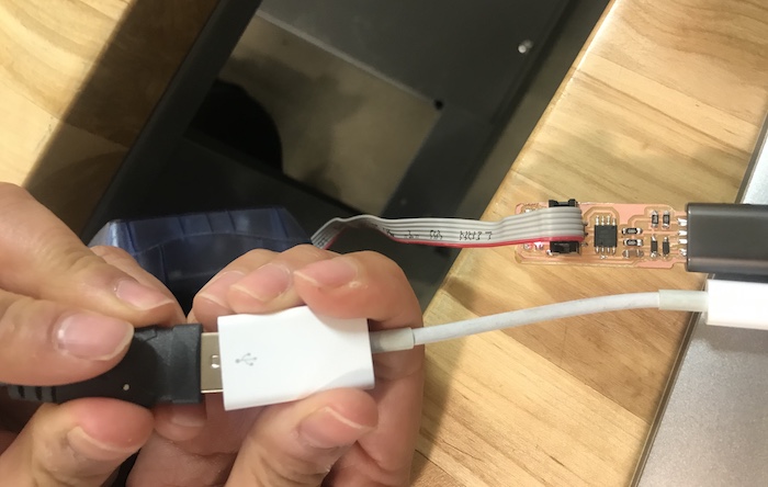 After, I plugged the ISP and connected it to my board. Important here is to remember the orientation. There is a small dot in the picture to understand the correct direction.